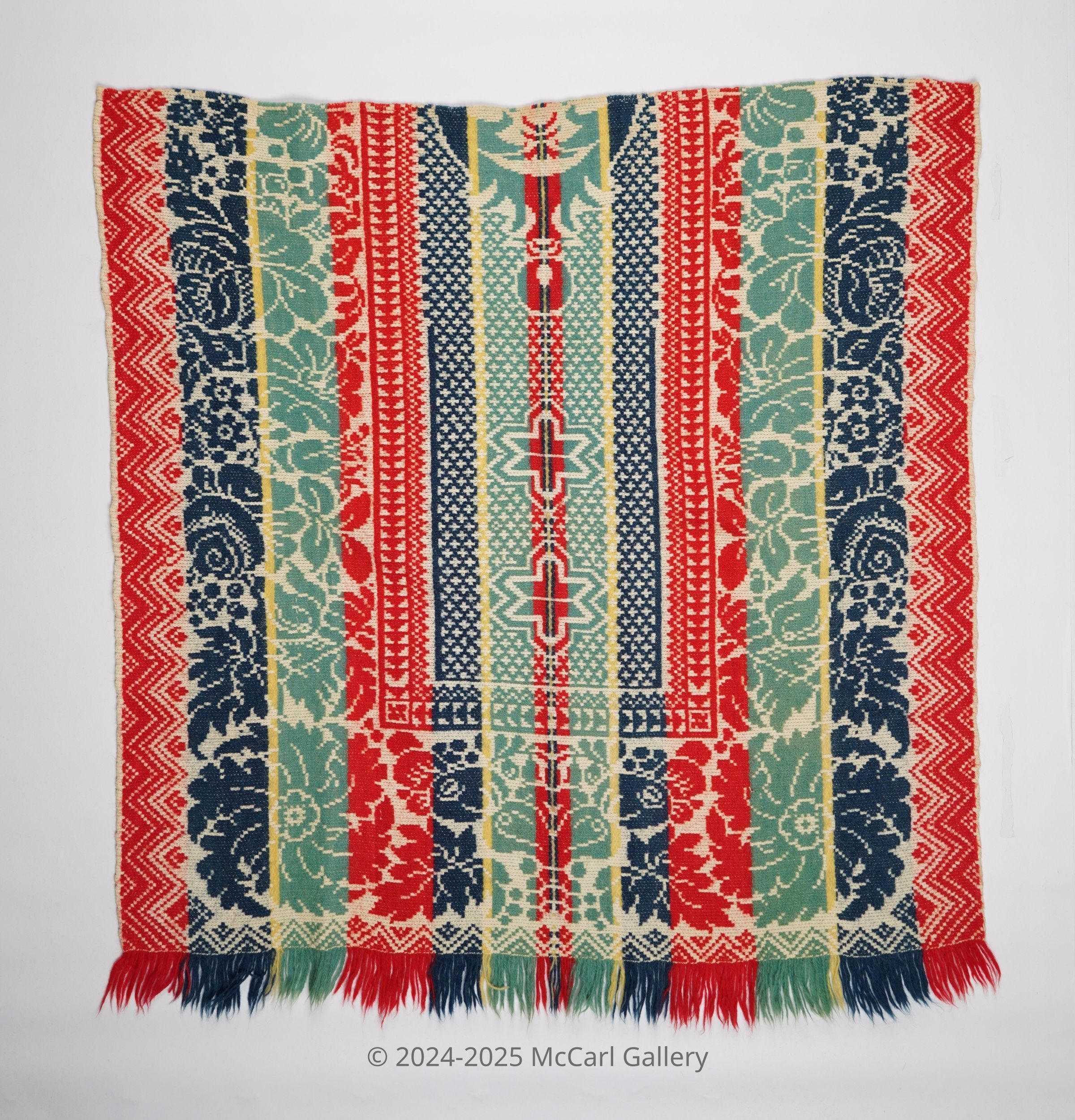 Yellow, teal, navy, red, and natural figured tied half doublecloth crib coverlet with border on three sides and self-fringe along bottom.Collection