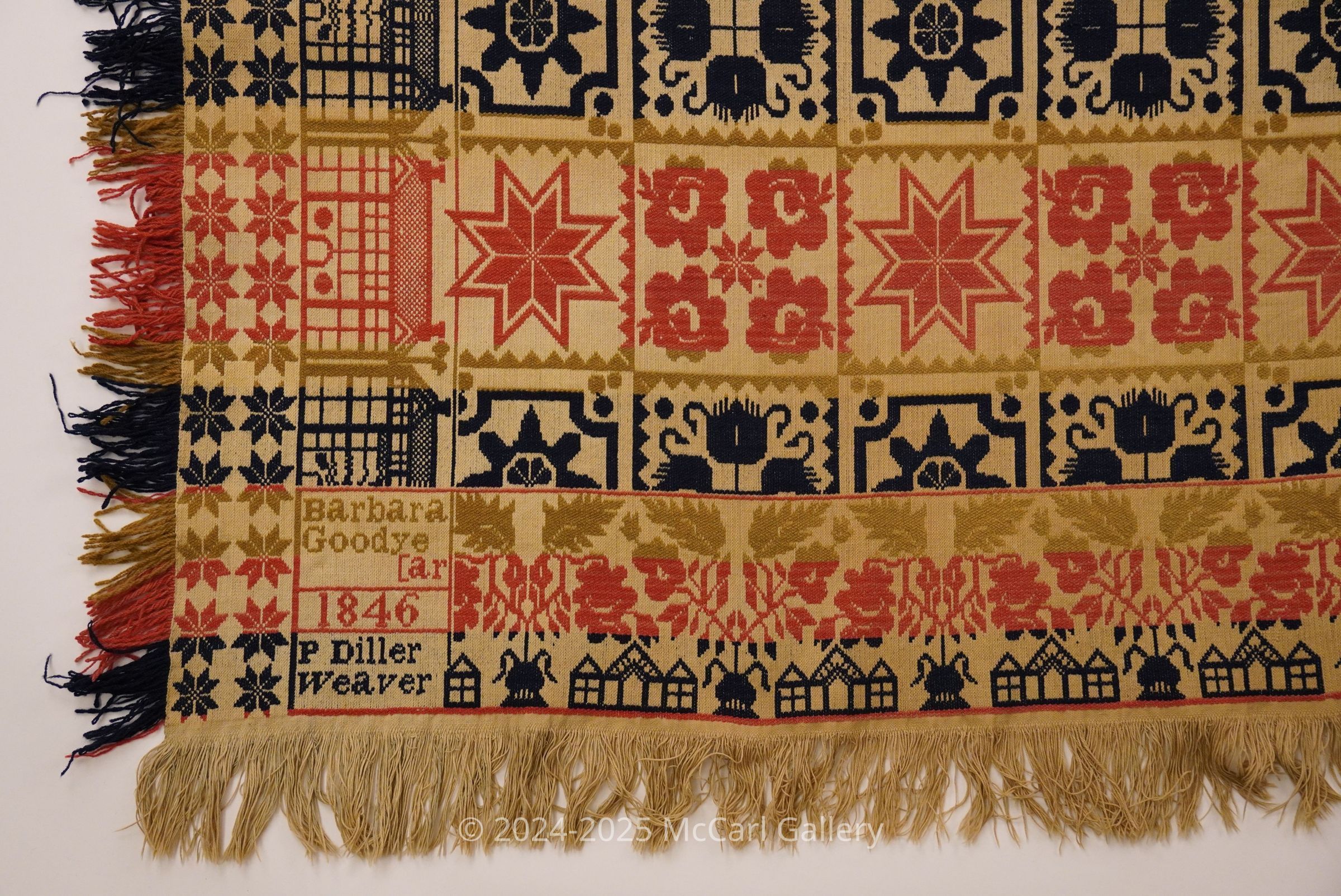 Pennsylvania coverlet by Peter Diller for Barbara Goodyear, 1846, tied beiderwandDescription