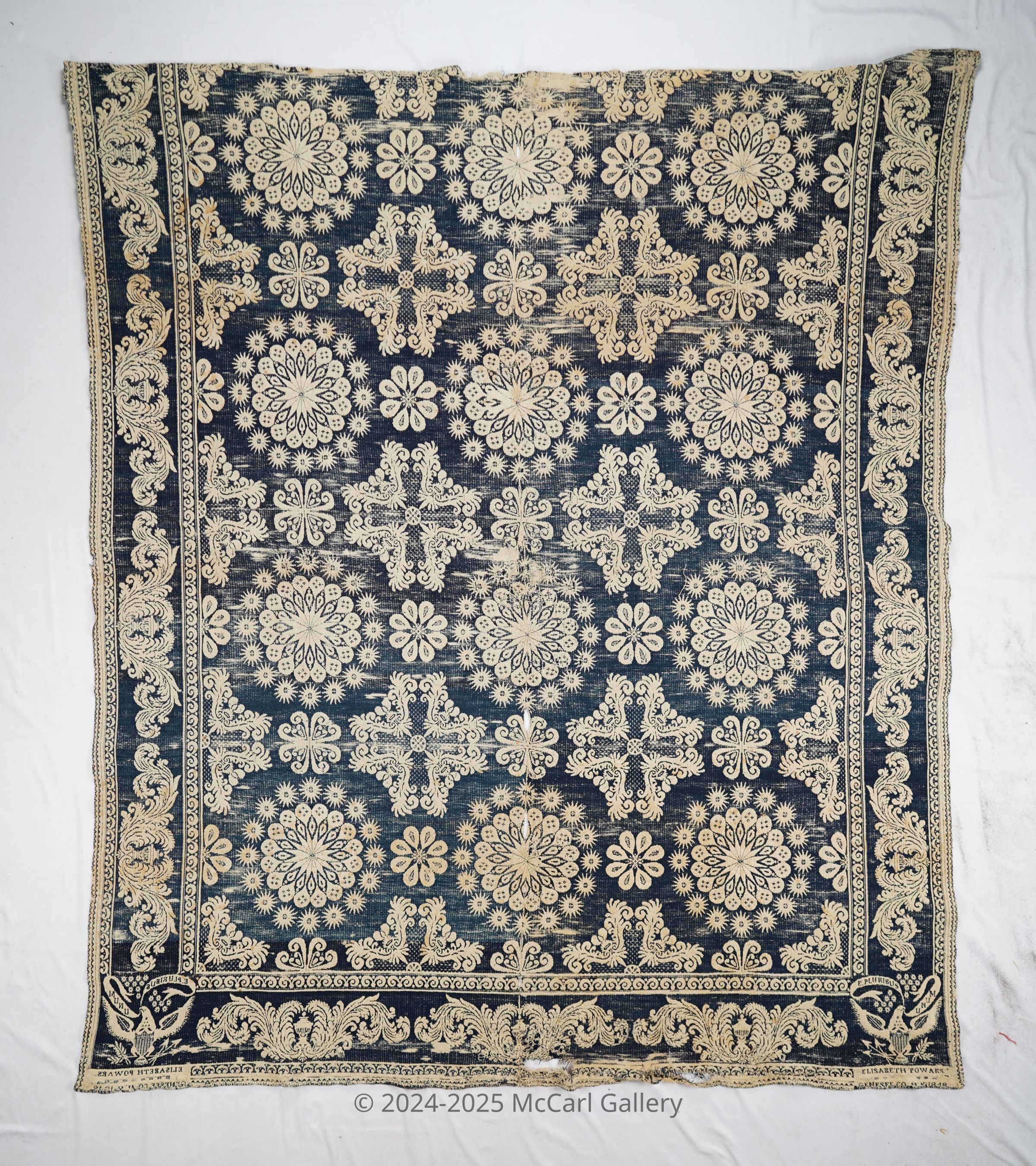 Natural and navy figured tied beiderwand 4:1 coverlet; two panels joined by a center seam. Border on three sides; no fringe.Collection