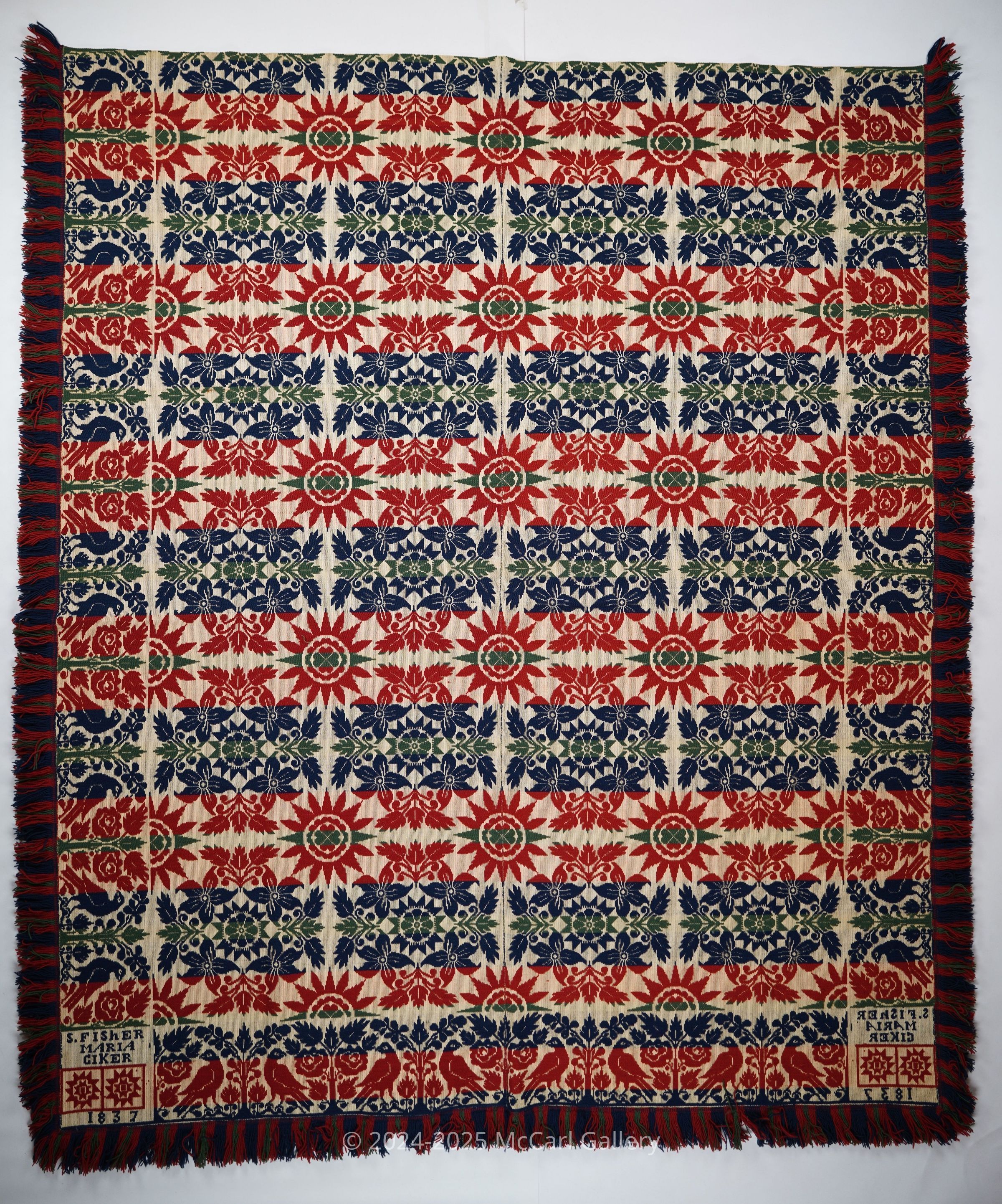 Green, red, navy, and natural figured tied half doublecloth coverlet with border and applied fringe on three sides. Two joined panels. Woven for Maria Giker by Samuel Fischer in Pennsylvania in 1837.Collection
