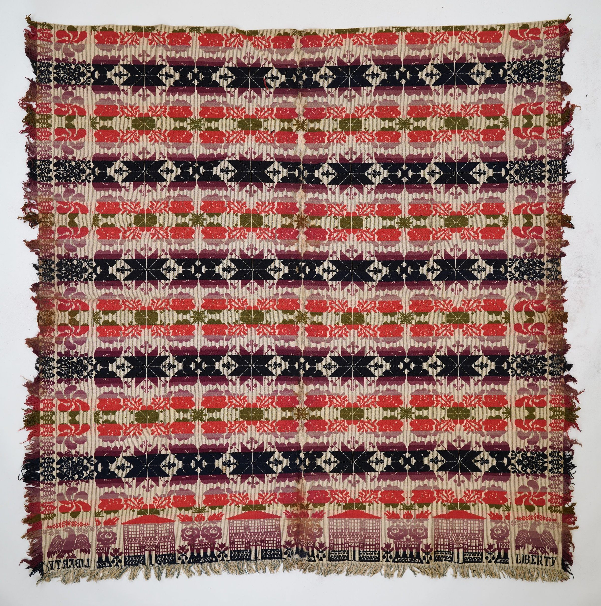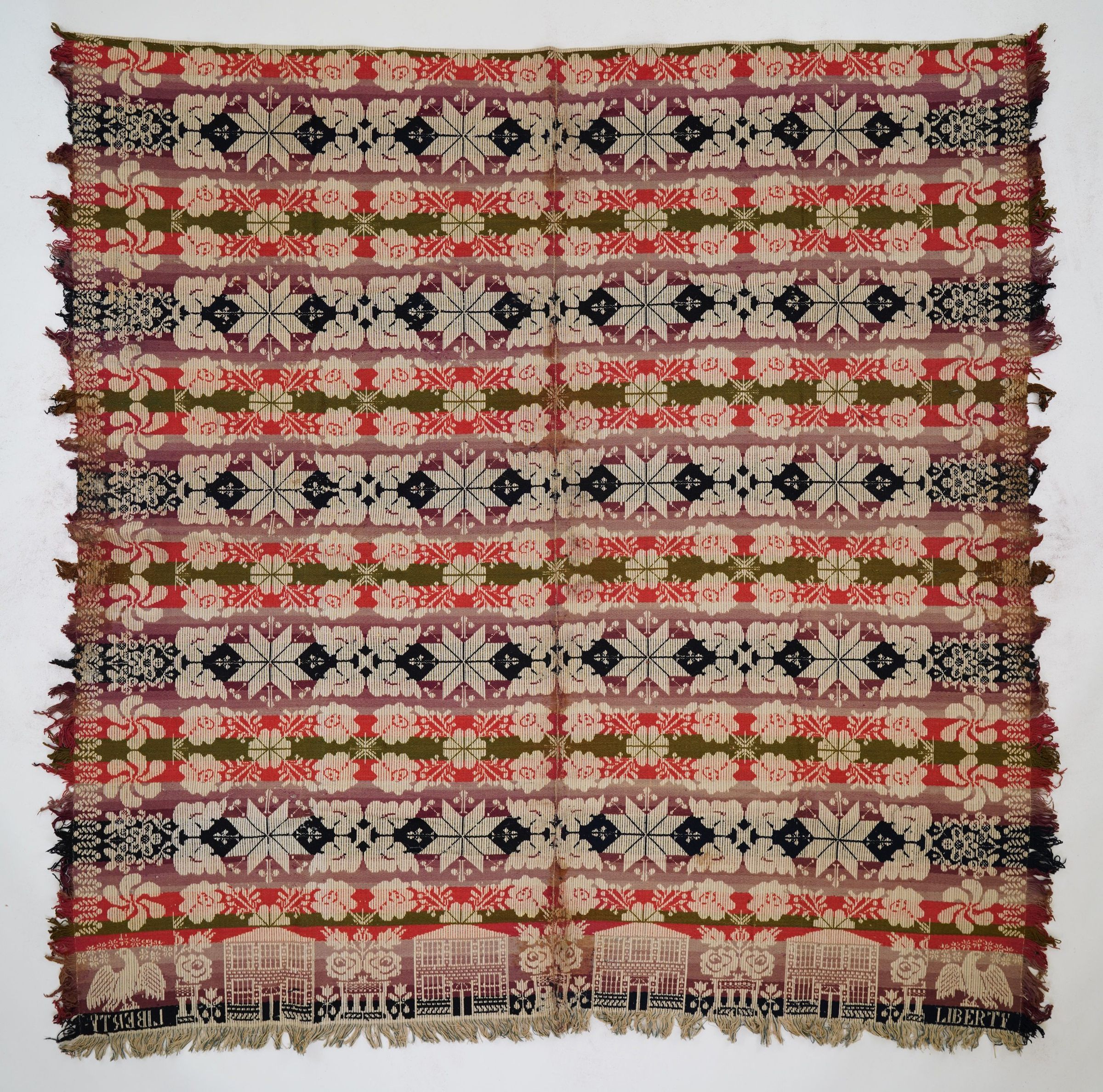 Red, green, navy and light purple figured tied Beiderwand coverlet; two panels joined by center seam, self-fringe on three sides, architectural border on bottom, floral and spiral borders on sides, centerfield pattern has stars, little ferns, and double flowers with clovers.Collection