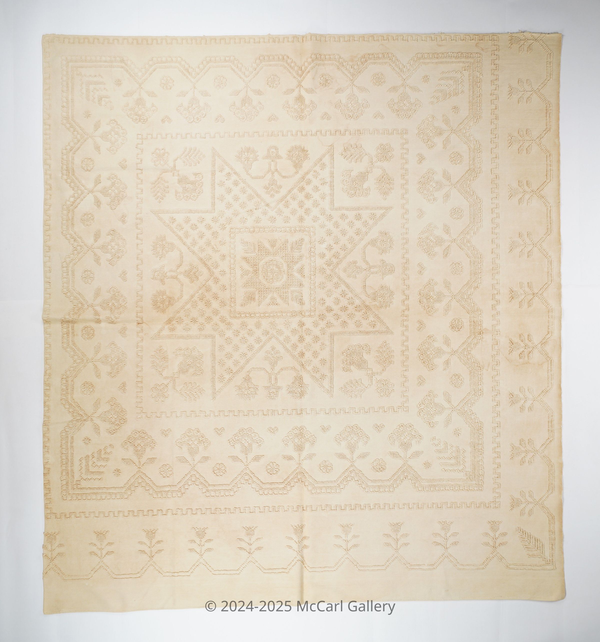 Natural figured boutonné coverlet with border on two sides. Seamless.