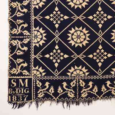 Indiana coverlet by David Isaac Grave for S.M., 1837, doubleweaveDescription