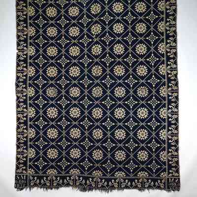 Navy and natural figured doublecloth coverlet with border on three sides and fringe on bottom edge. Two joined panels. Woven by David Isaac Grave for S.M. in Indiana in 1837.Collection