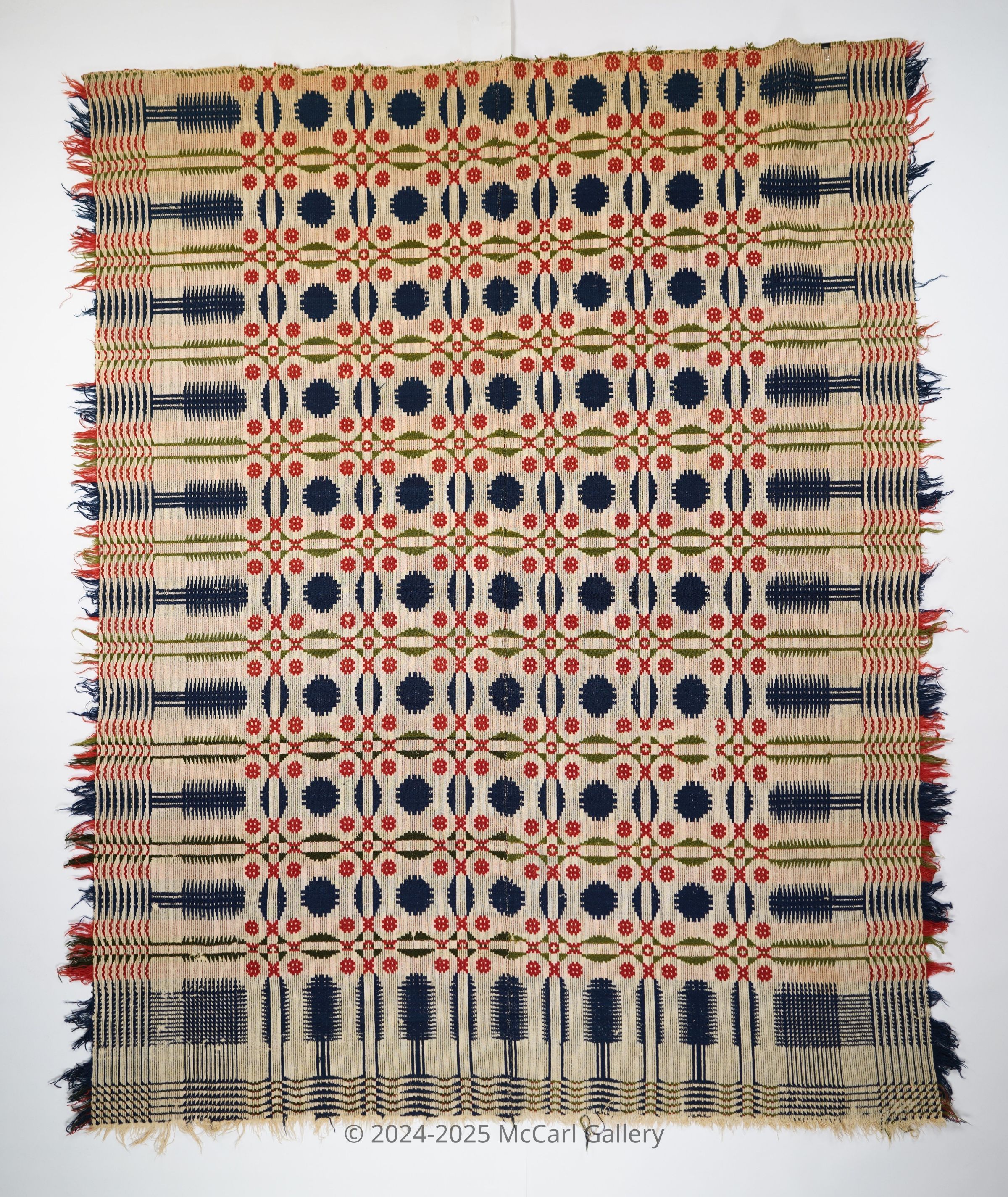 Red, green, navy, and natural geometric coverlet with self-fringe and border on three sides. Two joined panels.Collection