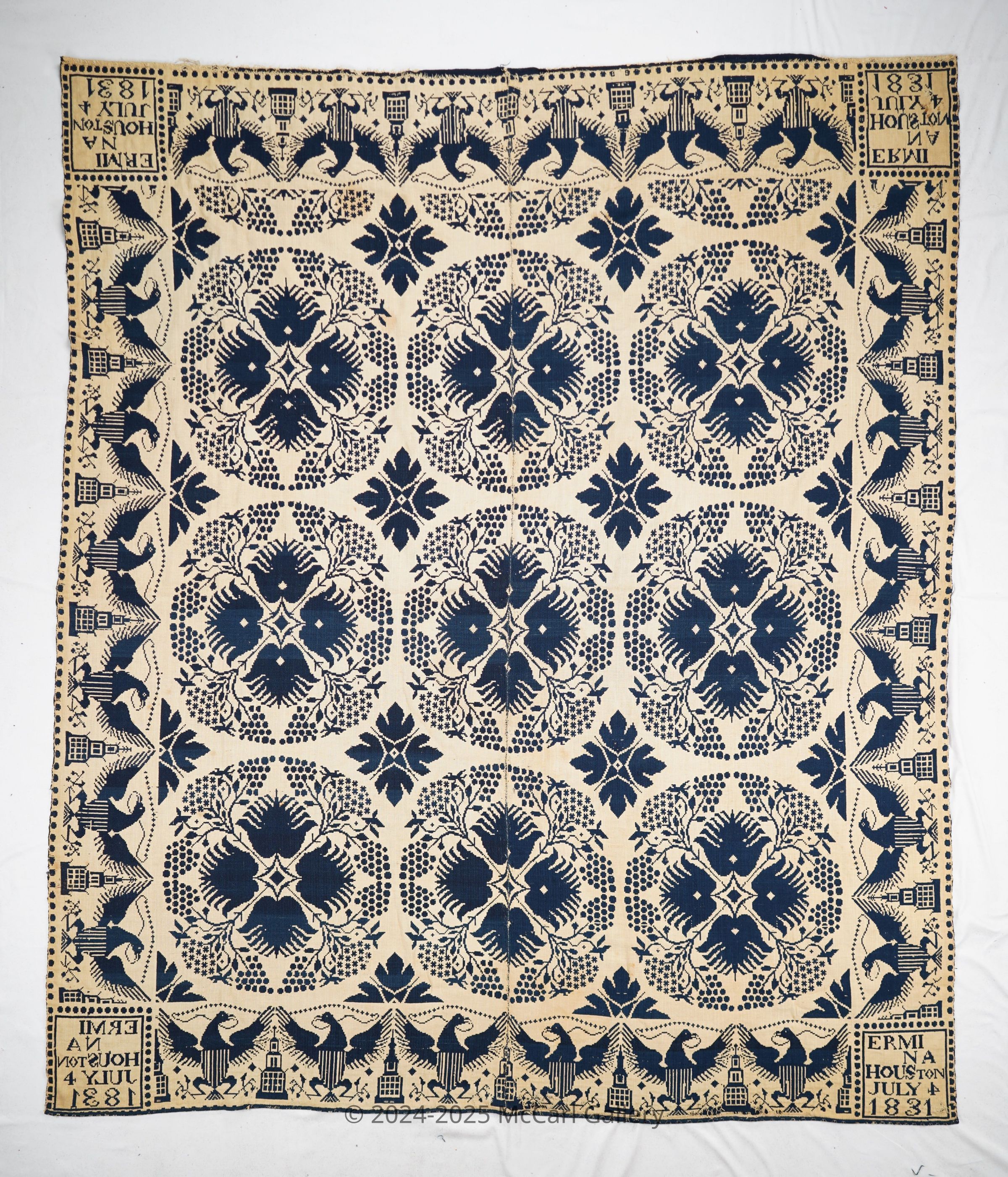 Natural and navy figured double weave coverlet; two panels joined by a center seam. Border on four sides; no fringe.Collection