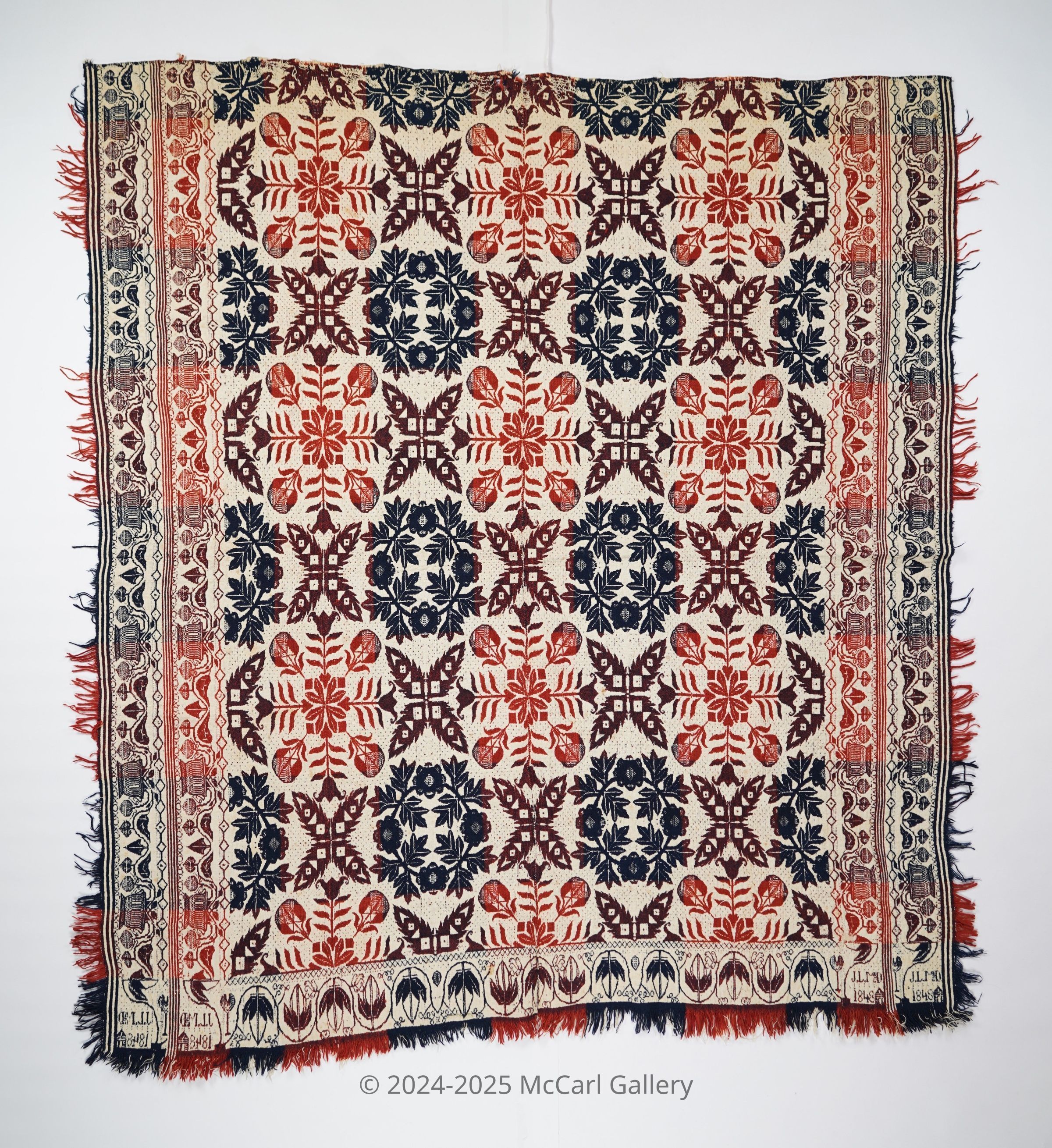 Red, navy, and natural figured doublecloth coverlet with border and self-fringe on three sides. Two joined panels. Woven by J.L.McD. in 1848.Collection