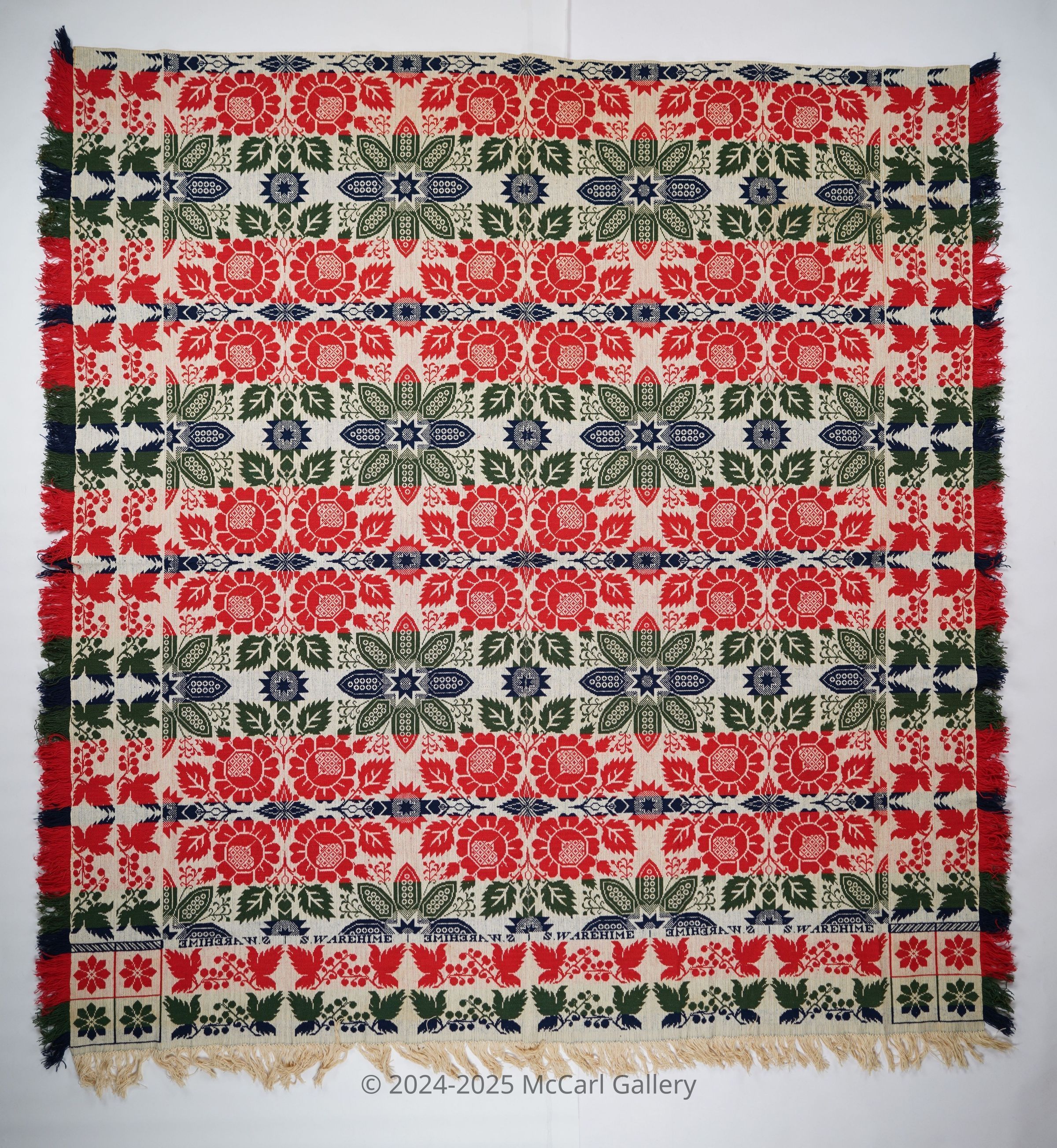 Red, green, navy, and natural figured tied half doublecloth coverlet with border and self-fringe on three sides. Seamless. Woven for S. Warehime in or near Pleasant Valley, Carroll Co., Maryland. Most contemporary instances of the surname Warehime appear in Carroll Co., MD, near the border with Pennsylvania.Collection