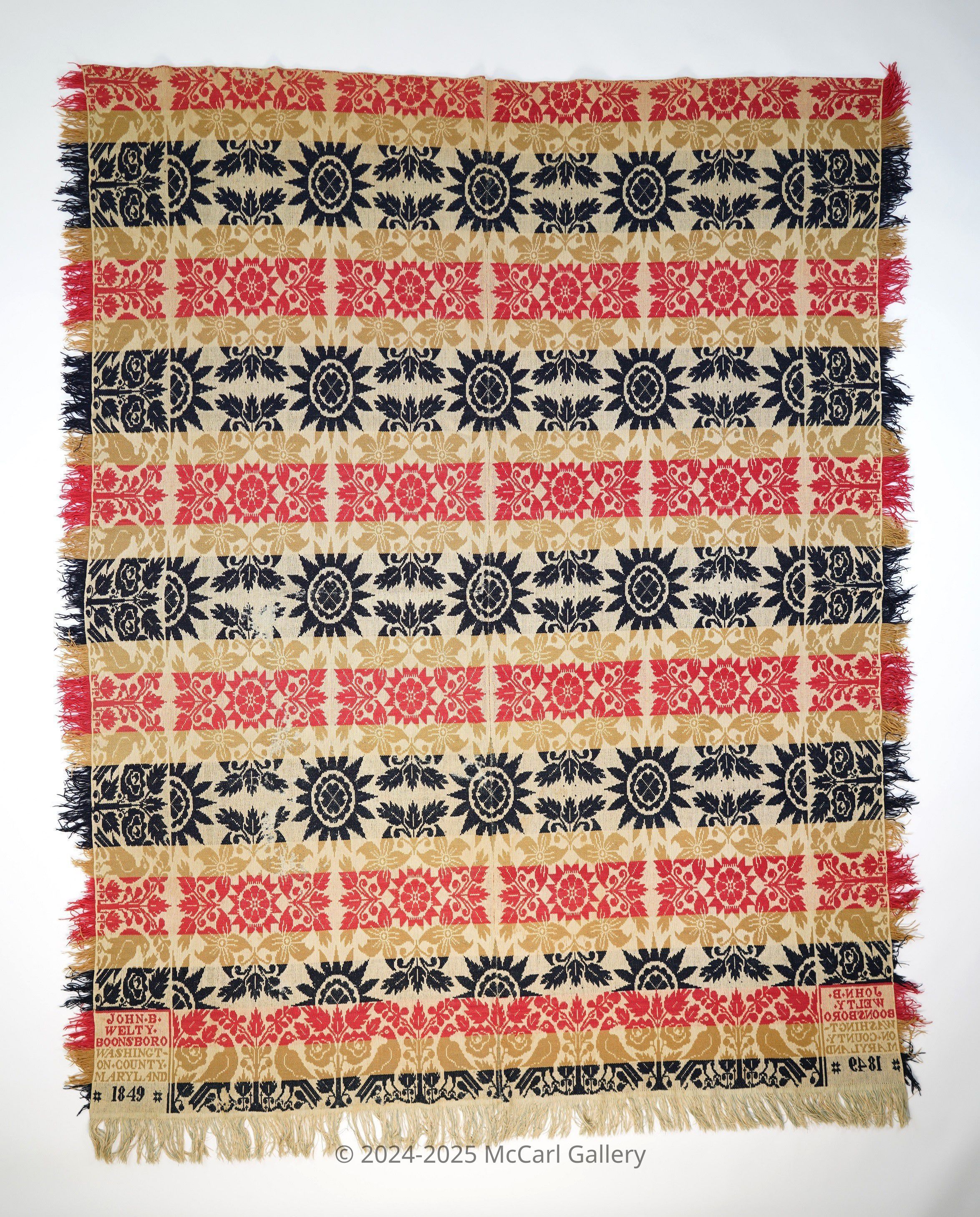 Red, Navy, Brown and White Jacquard Coverlet woven by John B. Welty of Boonsboro, Maryland in 1849. It has his name and date woven into the corner blocks. Two panels joined by a center seam with self-fringe on three sides. Centerfield pattern with geometric starbursts and Lilies of France motif, and border with distelfinks and foliage; 69" x 89”.