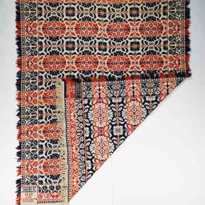 Red and navy blue figured tied Beiderwand coverlet with floral borders and self-fringe on three sides. Woven by Henry O. Overholt for Catharine Zundel in 1842.Collection