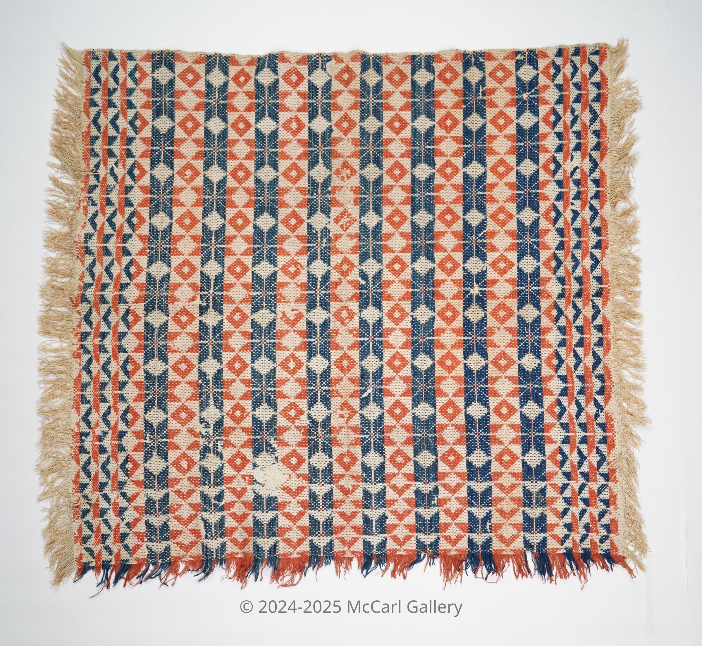 Red, navy, and natural geometric crib coverlet with border and self-fringe on three sides.