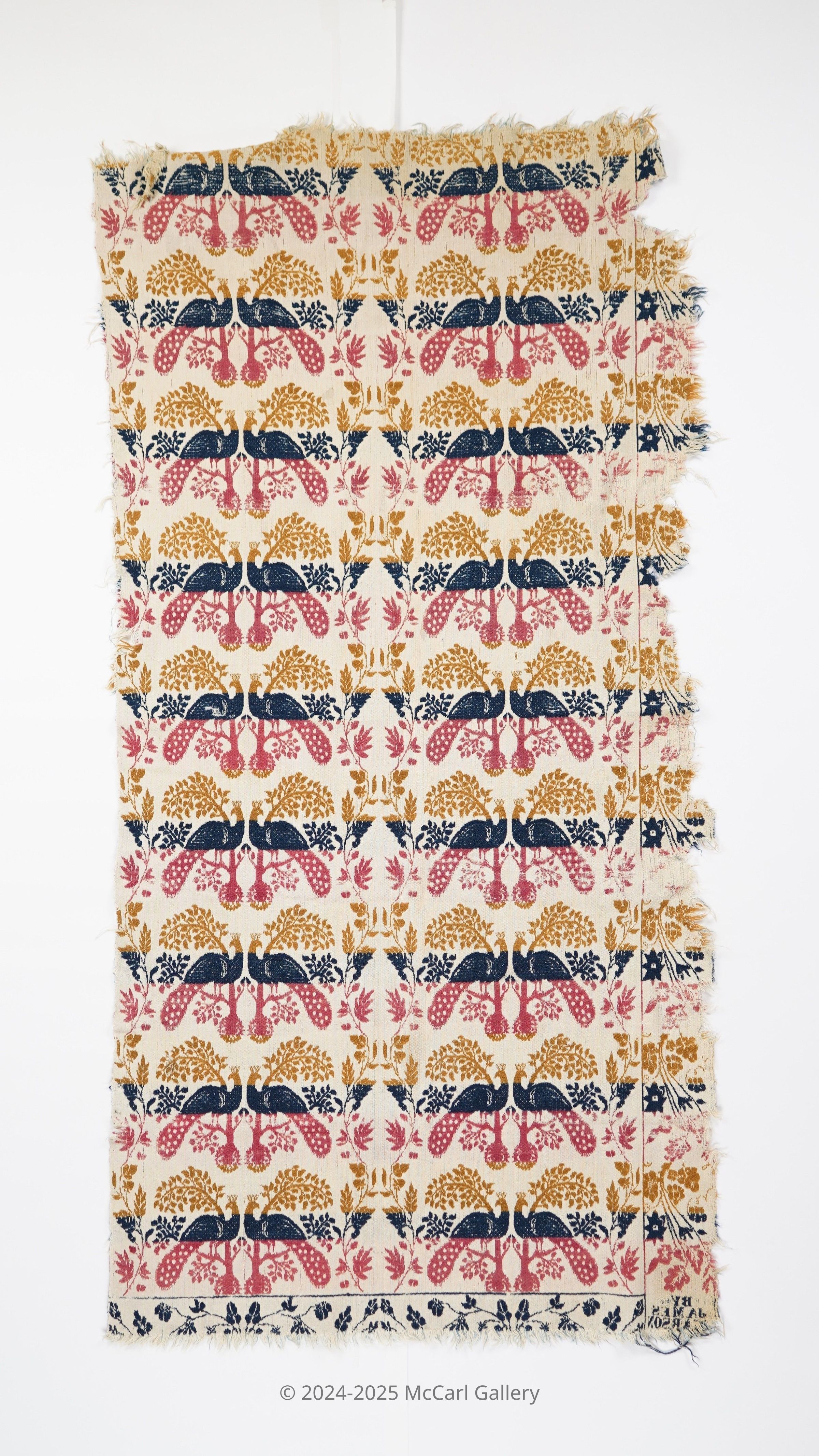 Red, navy, burnt sienna, and natural figured true beiderwand coverlet with border on two sides and self-fringe along bottom. One panels. Woven by James Pearson.Collection