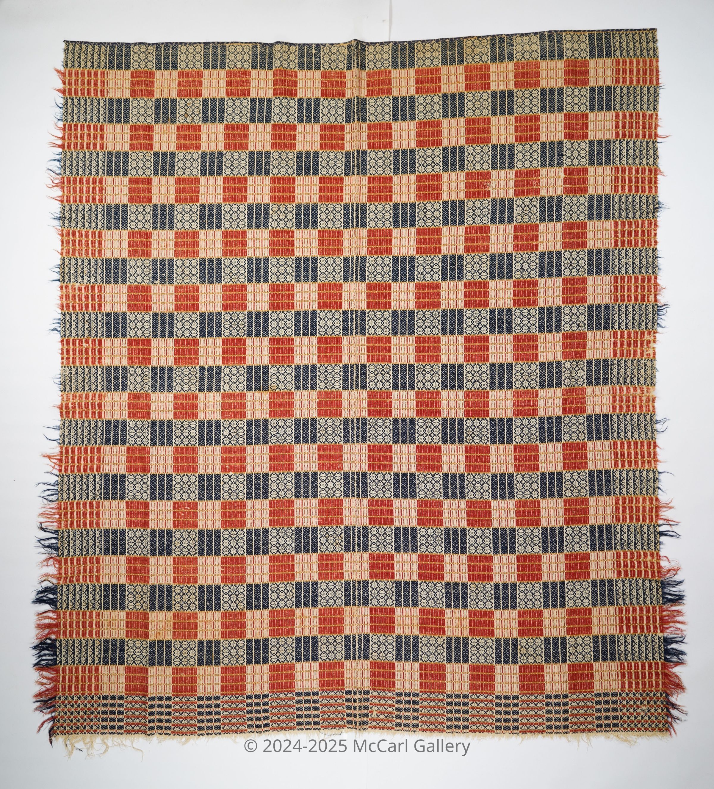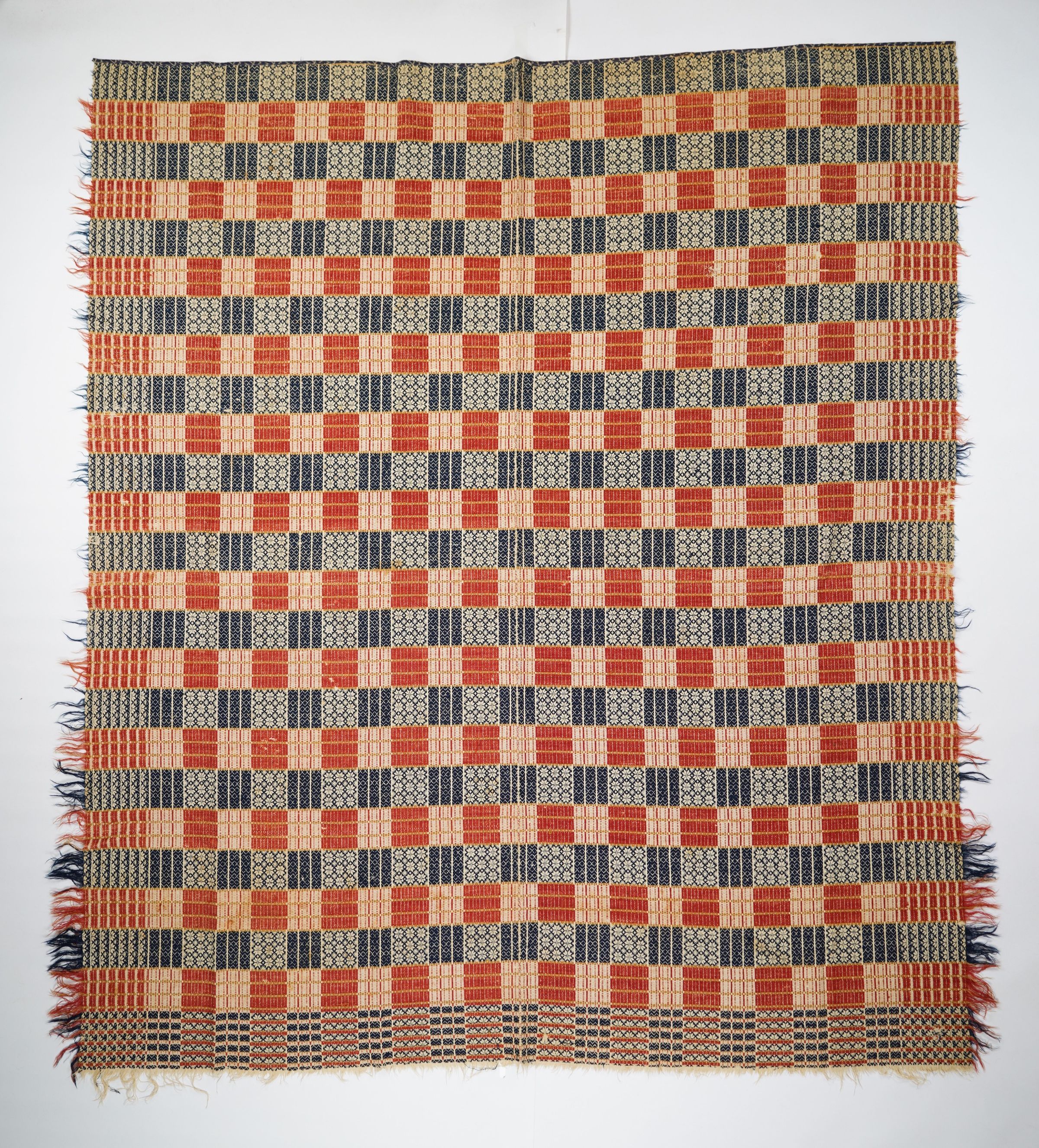 Red, navy, yellow, and natural geometric coverlet with border and self-fringe on three sides. Two joined panels.Collection