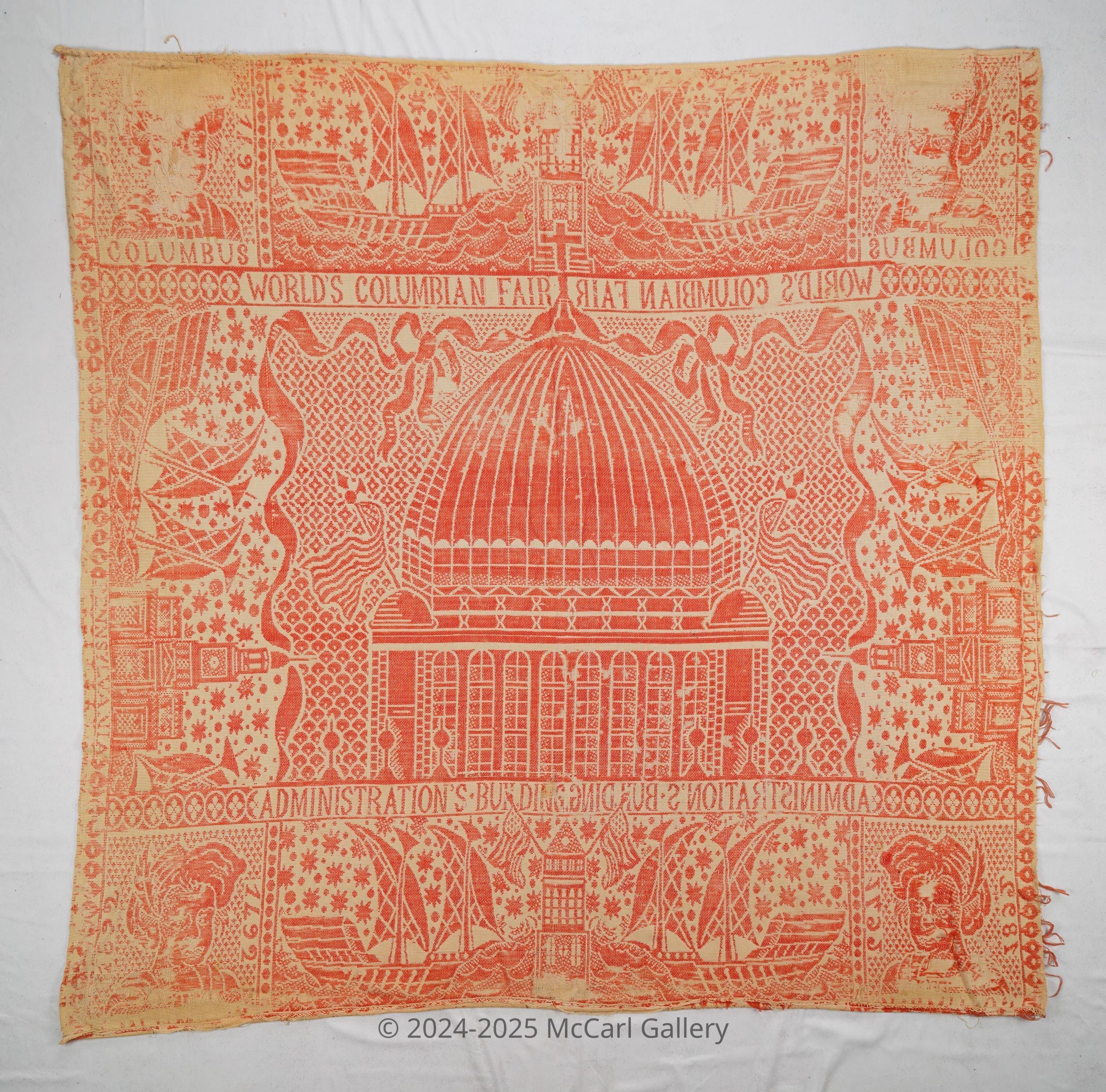 Natural and red figured double weave coverlet; seamless. No fringe; border on four sides; four cornerblocks. Depictions of 1892 Columbian Fair.