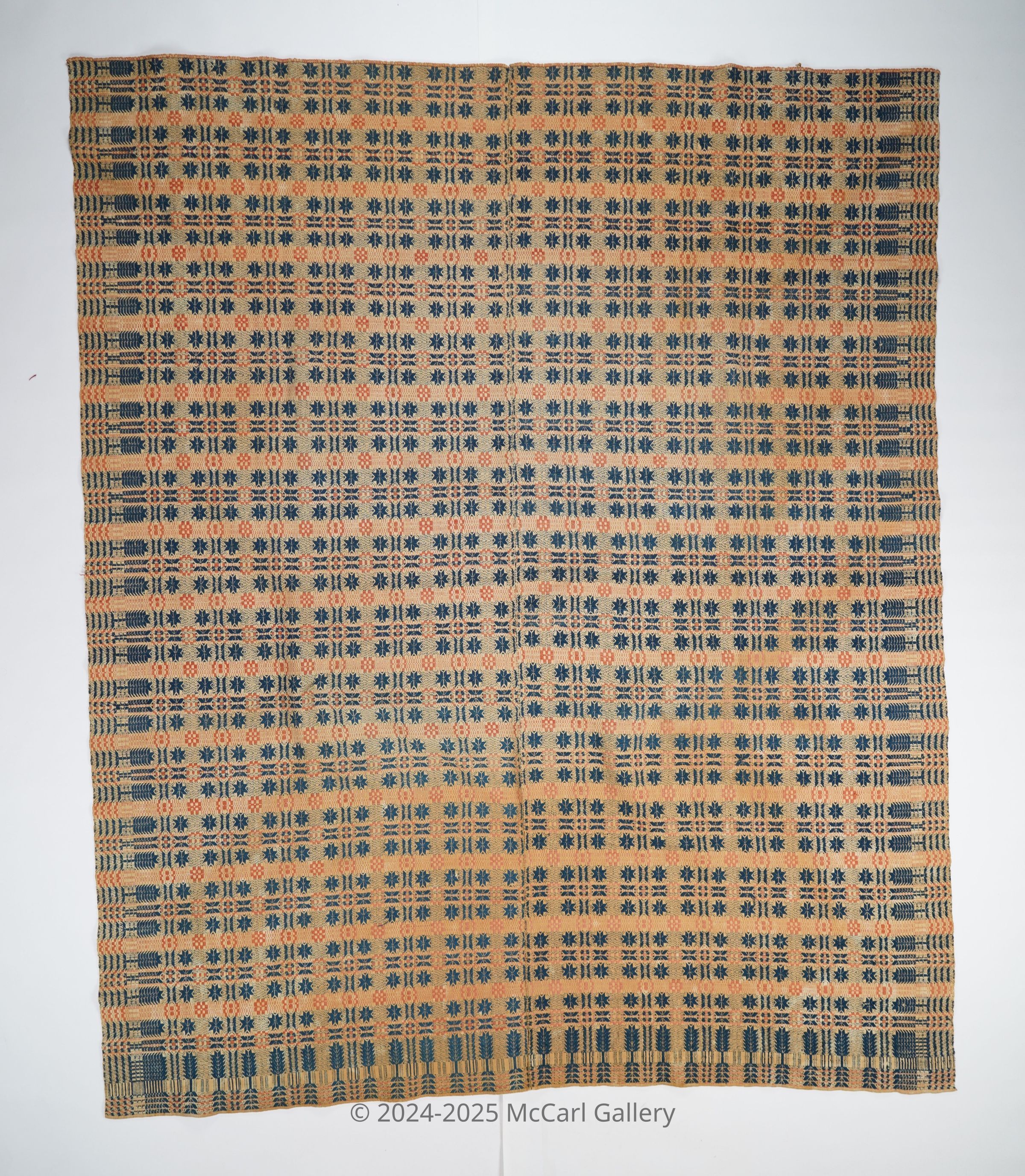 Red, navy, and natural geometric coverlet with border on three sides. Two joined panels.