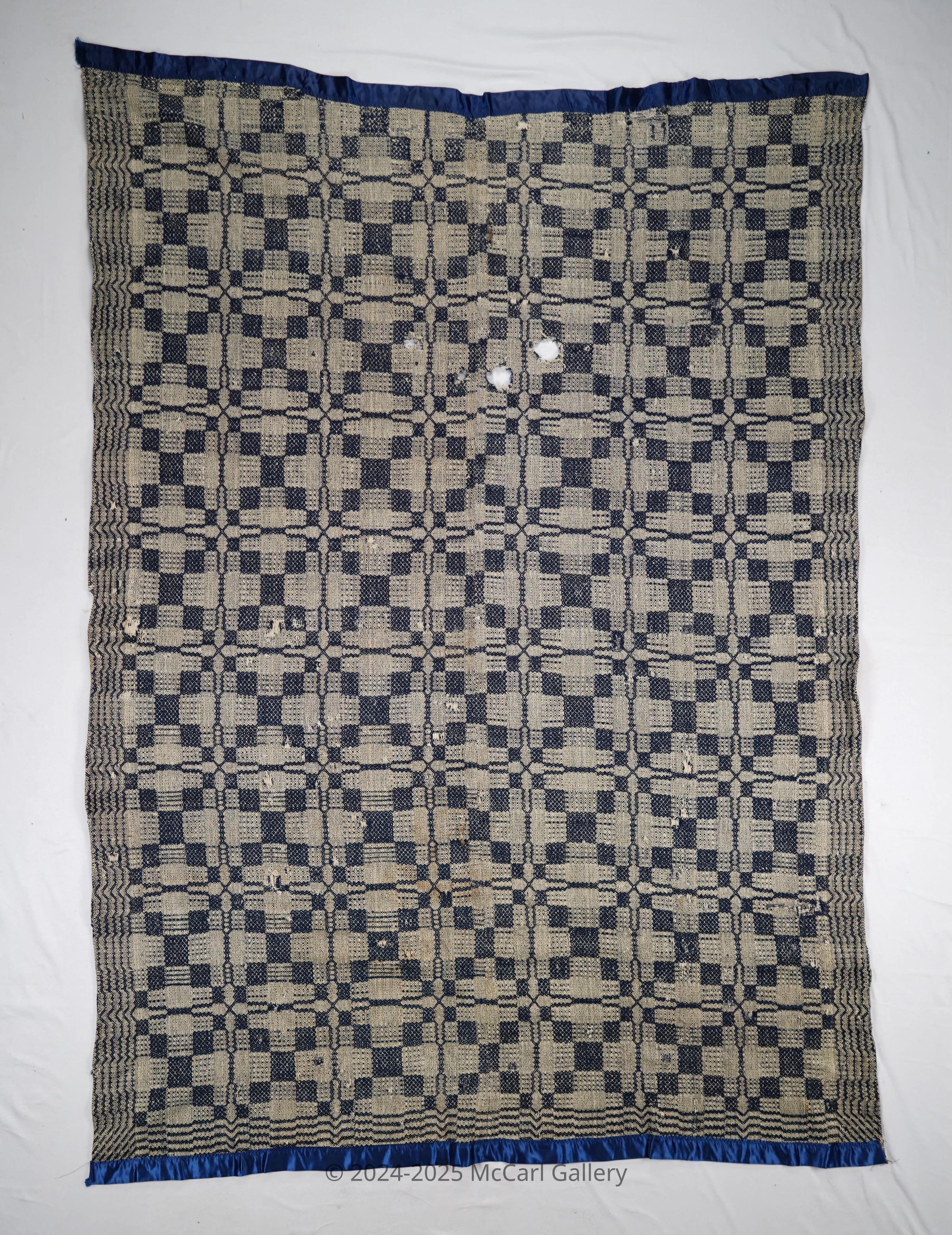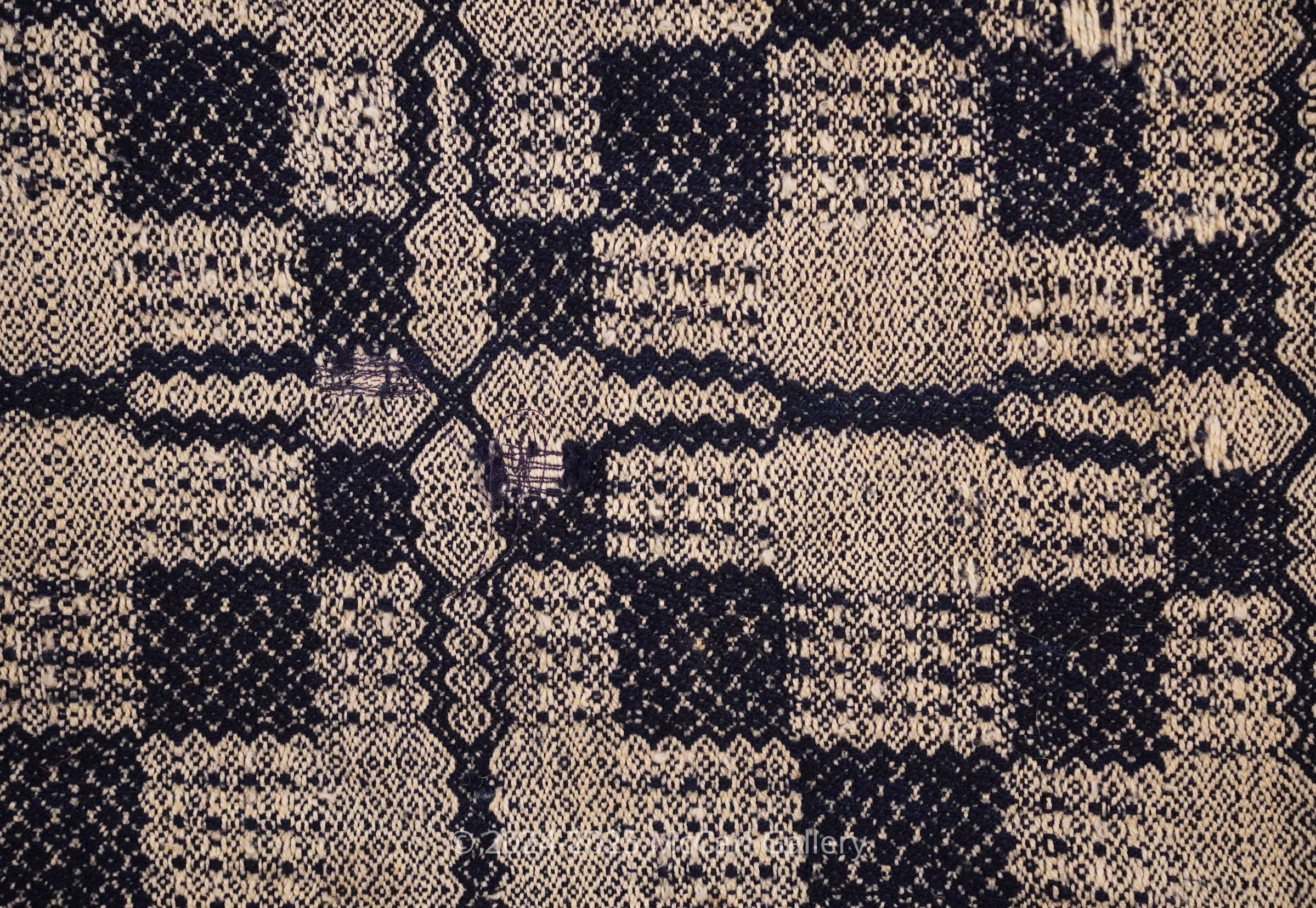 Natural and navy geometric gebrochene coverlet; two panels joined by a center seam; border on three sides; no fringe.
