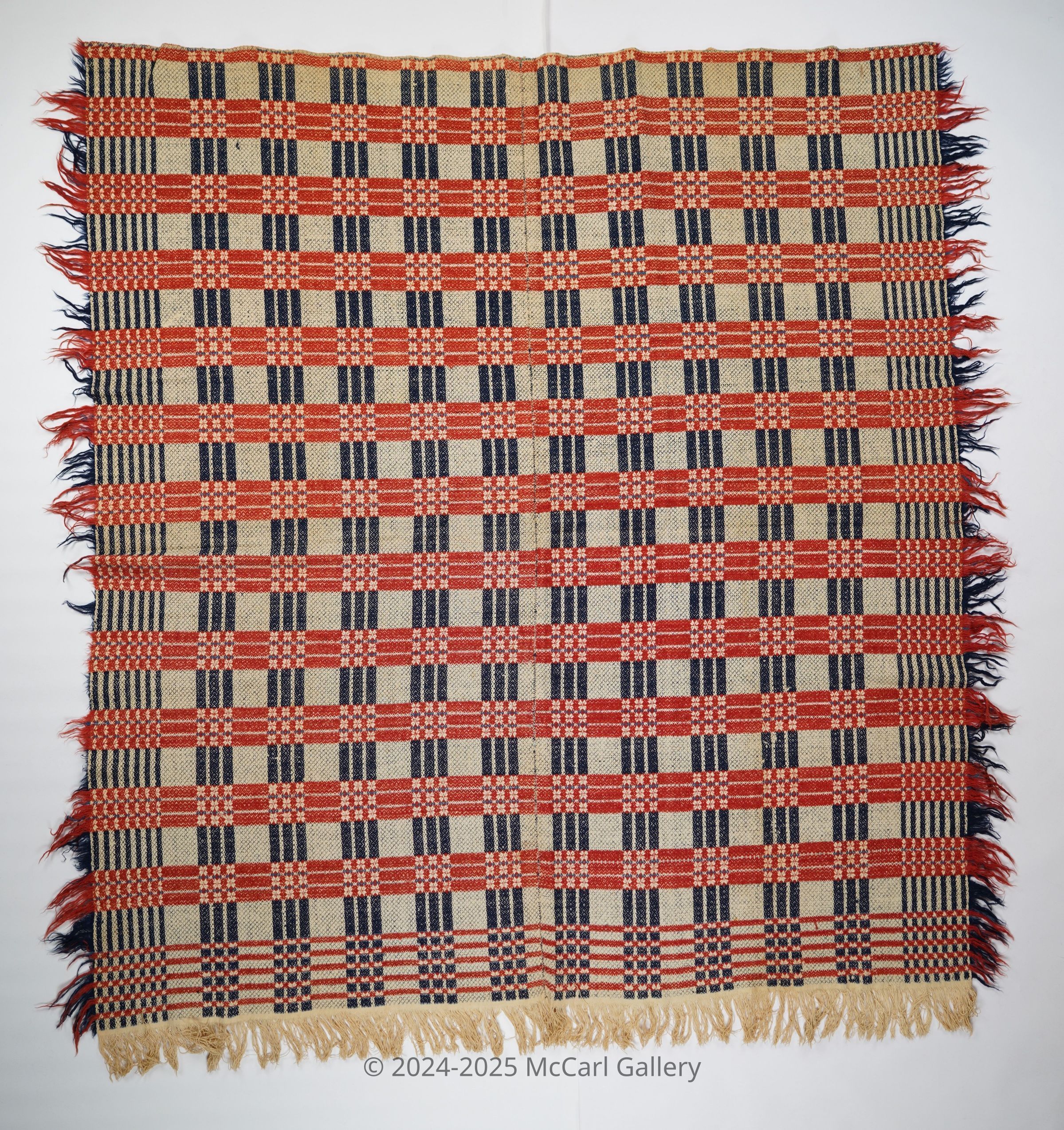 Red, blue, navy, and natural geometric point twill coverlet with border and self-fringe on three sides. Two joined panels.Collection