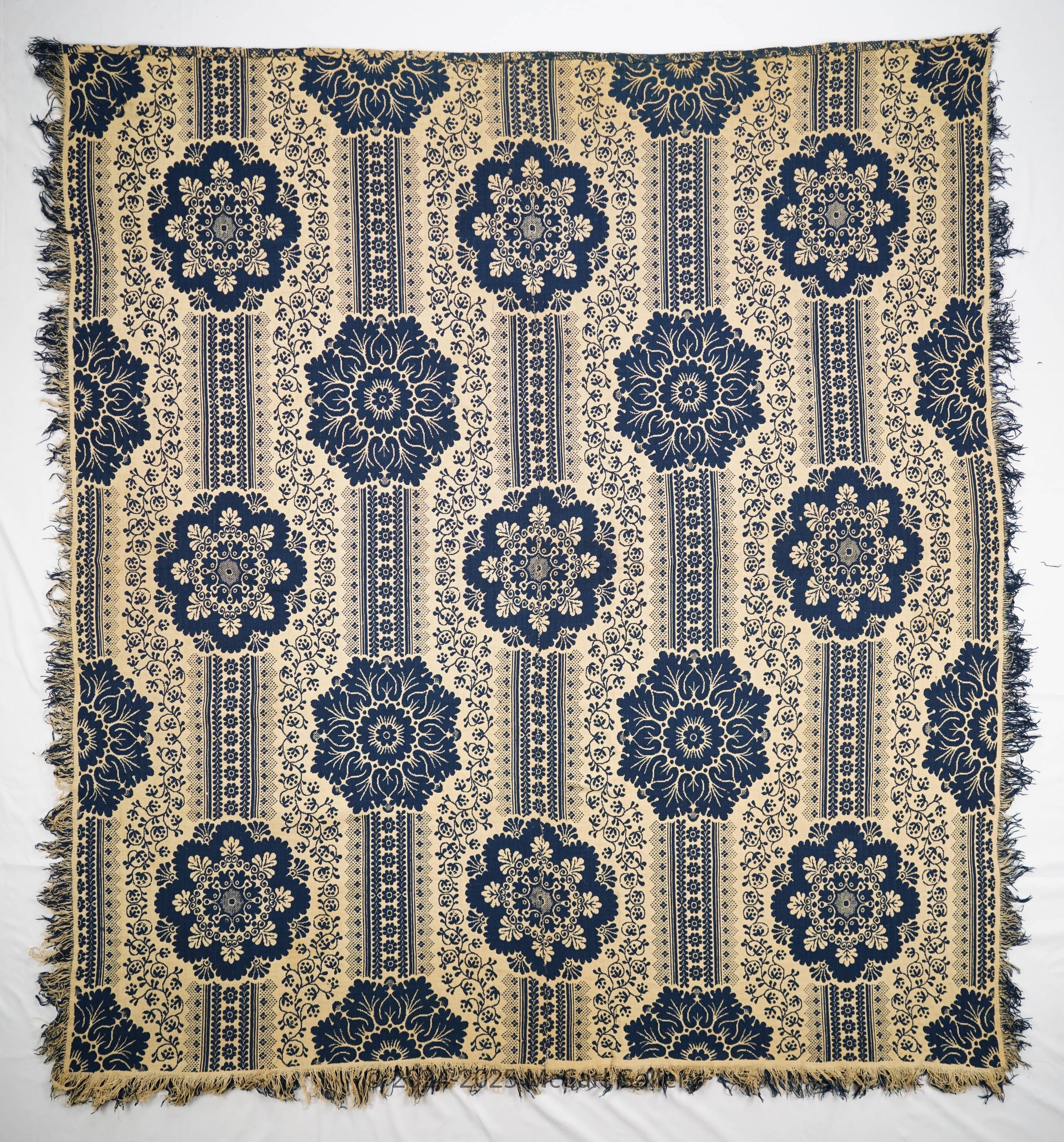 Navy and natural figured double weave coverlet; two panels joined by a center seam. Fringe on three sides.