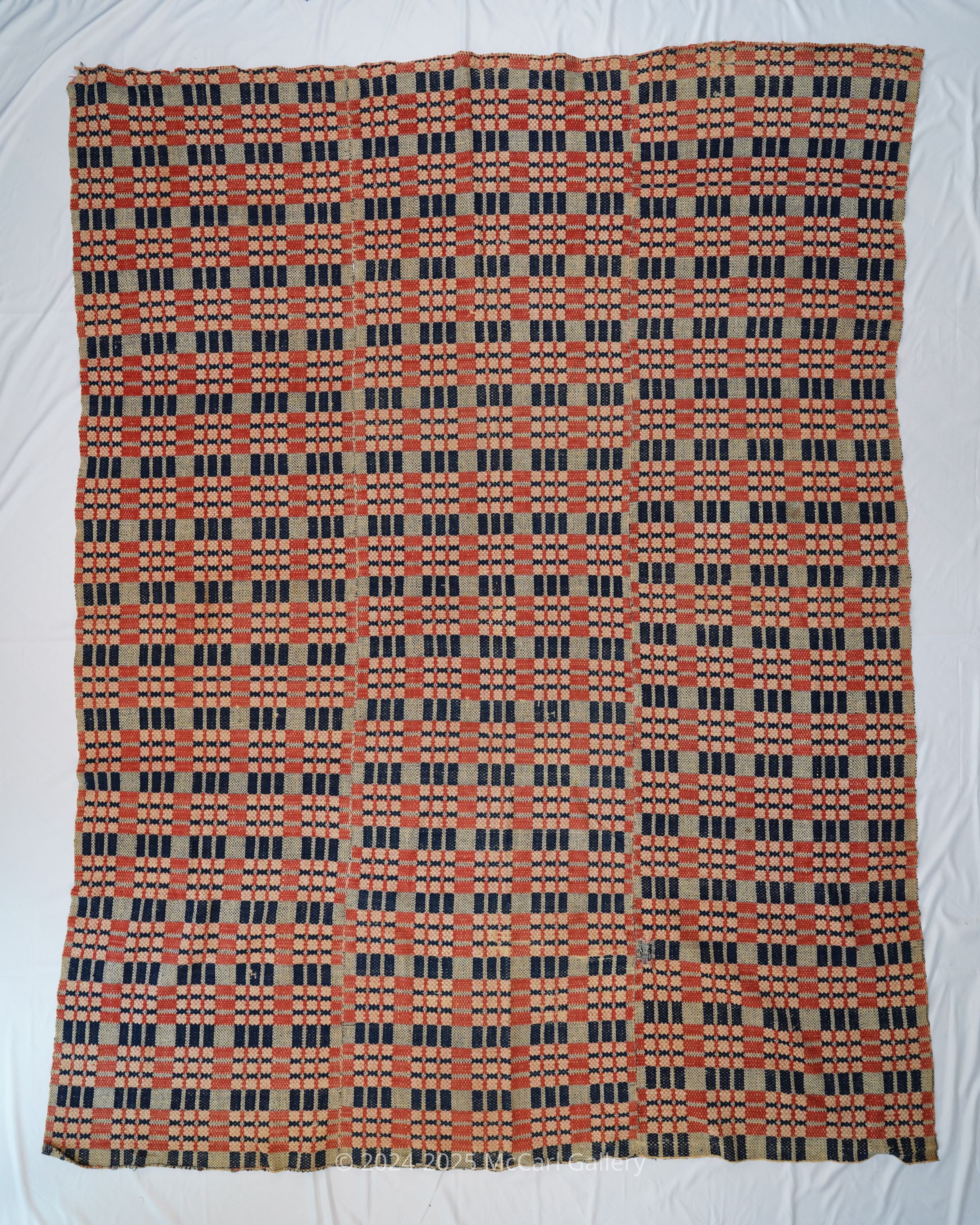 Navy, red and natural overshot coverlet; three panels joined