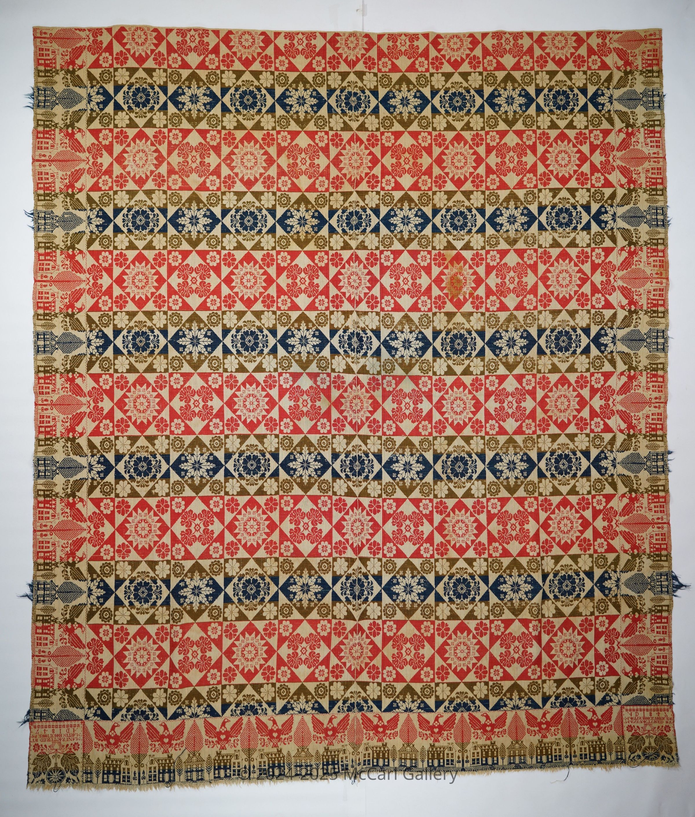 Red, olive, navy, and natural figured tied half doublecloth coverlet with border on three sides. Two joined panels. Woven by Martin Hoke in York Co., Pennsylvania in 1847.Collection