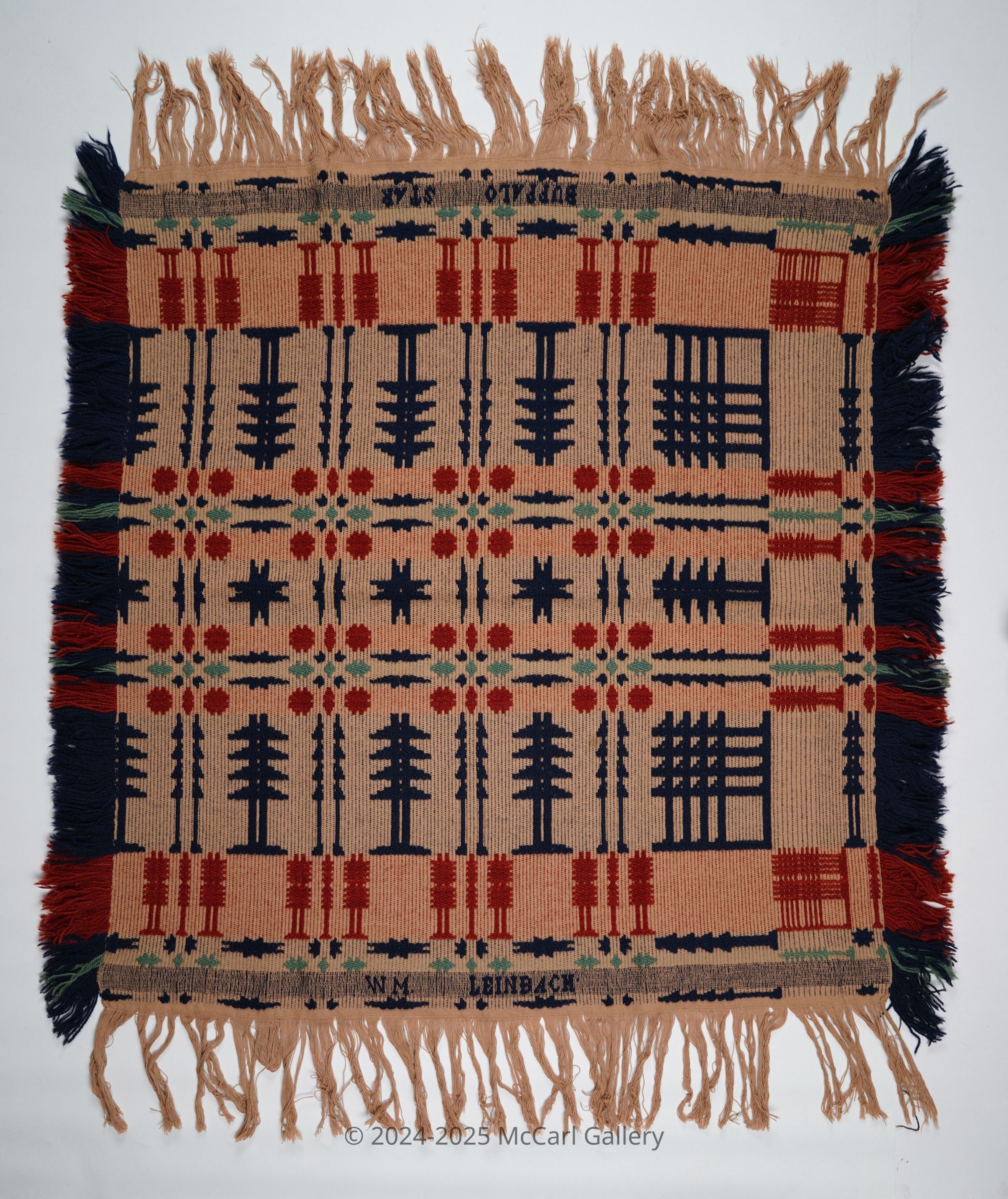 Blue, navy, red, and natural geometric tied half doublecloth crib coverlet with border on three sides and self-fringe on four sides. Woven by William Leinbach in Myerstown, Lebanon Co., Pennsylvania.Collection