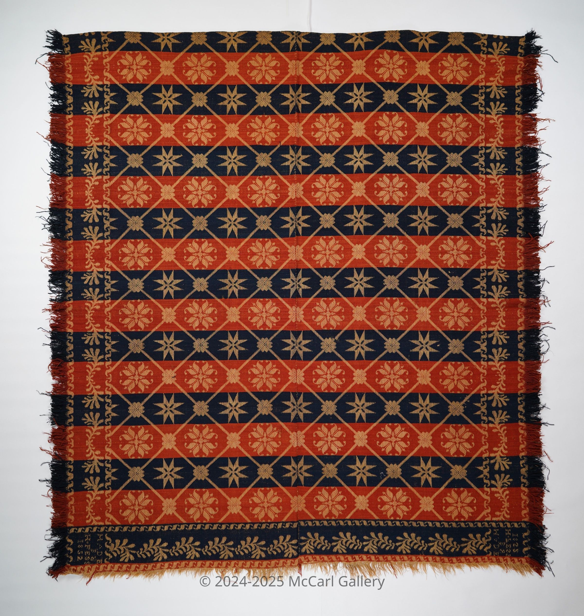 Red, navy, and natural figured coverlet with border and self-fringe on three sides. Woven by Henry Fess in Westmoreland Co., Pennsylvania in 1852.Collection