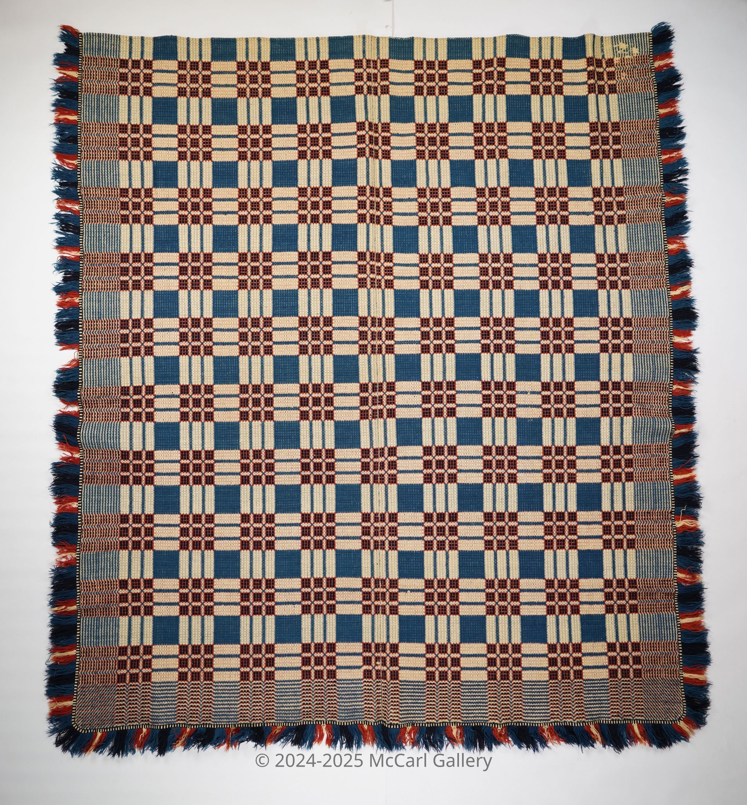 Red, navy, blue, and natural geometric overshot coverlet with border and applied fringe on three sides. Two joined panels.Collection