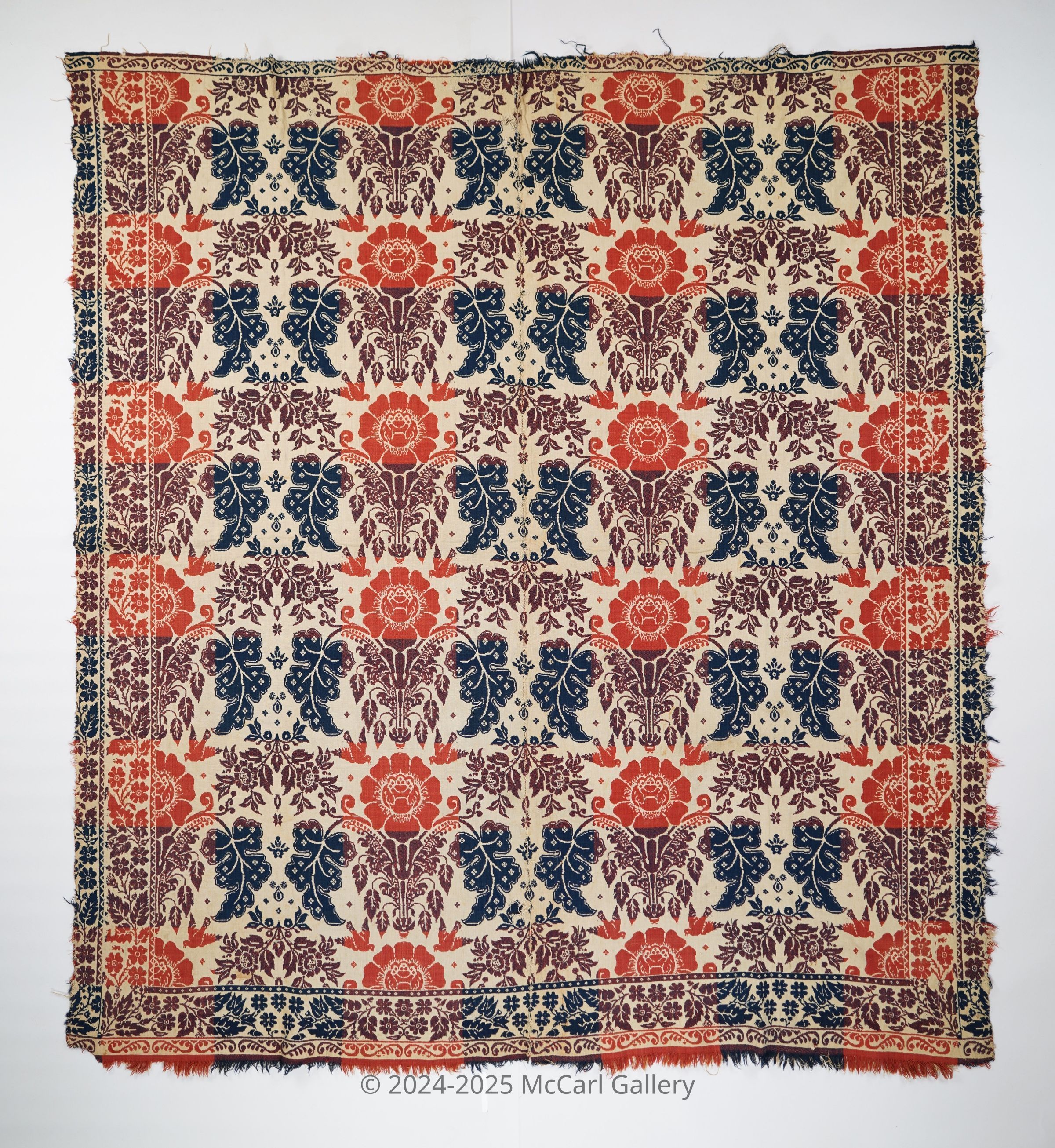 Red, navy, and natural figured double weave coverlet with self-fringe along bottom and floral border on three sides. Two joined panels.Collection