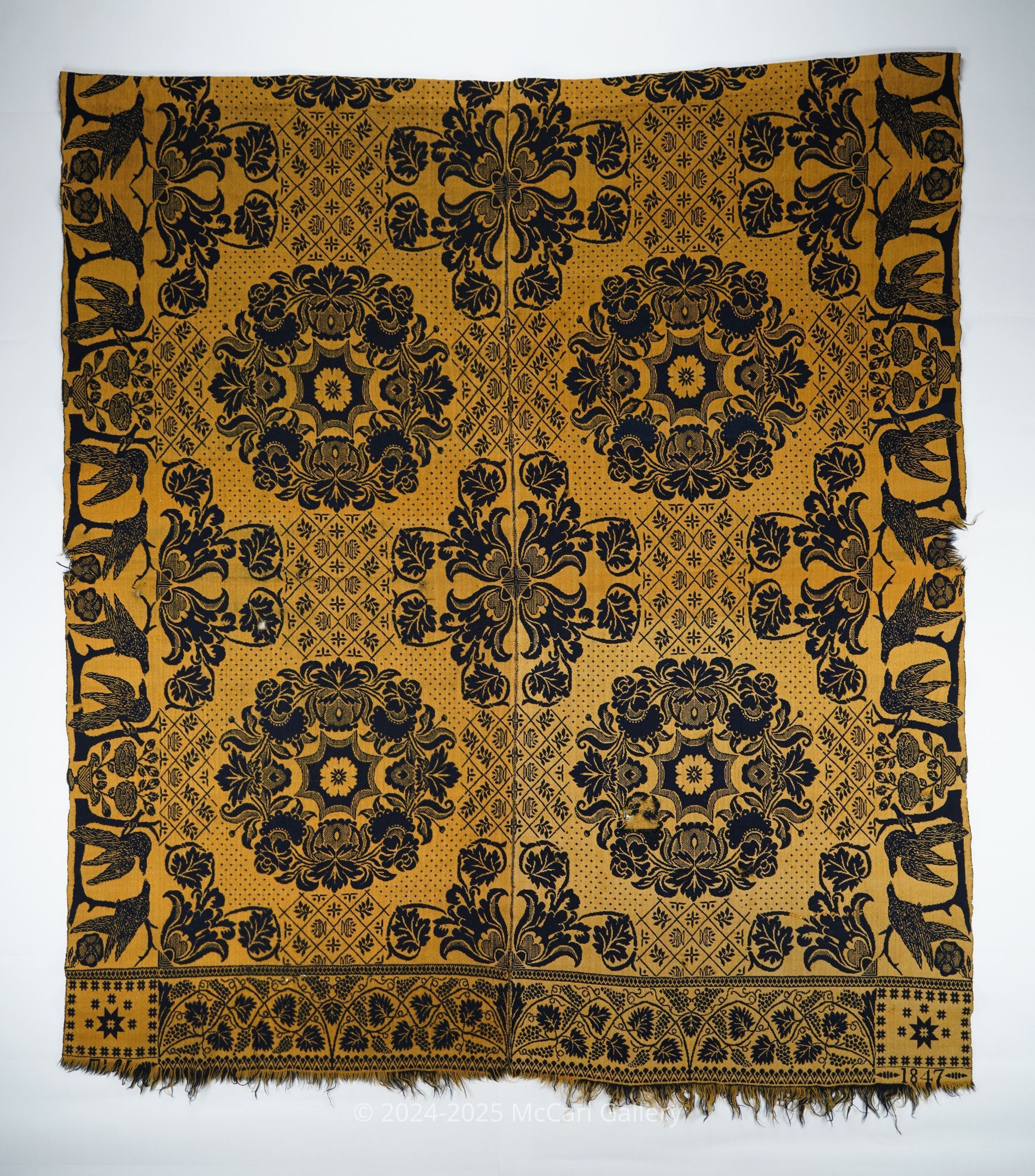 Yellow and navy figured doubleweave coverlet with border on three sides and self-fringe along bottom. Two joined panels. Woven by Samuel Stinger in Indiana in 1847, based on Starfield trademark.Collection