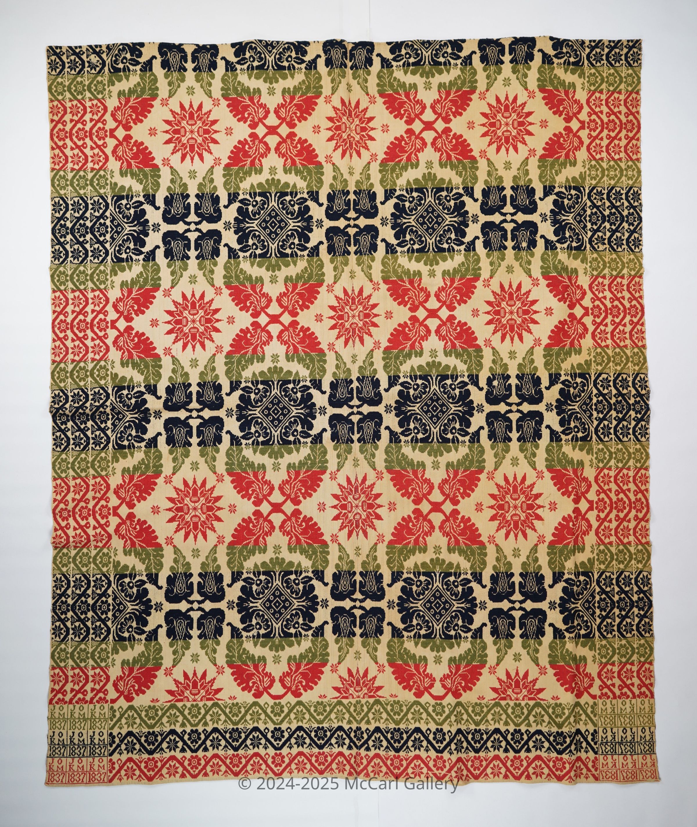 Red, green, navy, and natural figured tied half doublecloth coverlet with border on three sides. Two joined panels. Woven by John Kaufman in Hilltown Twp., Bucks Co., Pennsylvania in 1837.Collection