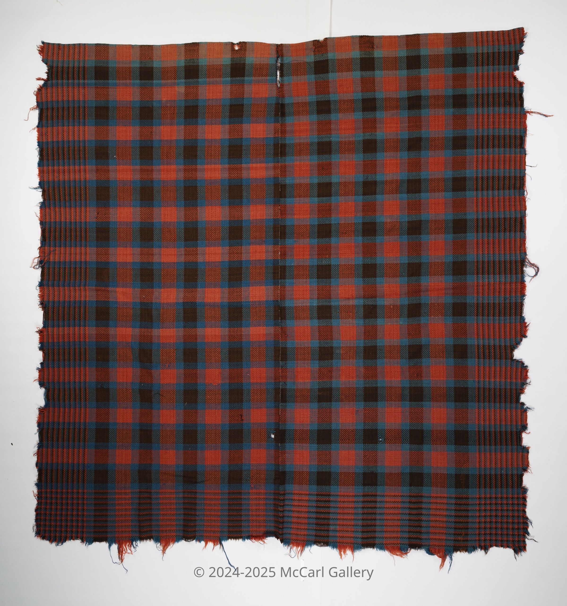Red, blue, and brown geometric point twill coverlet with border and self-fringe remnants on three sides. Two joined panels.