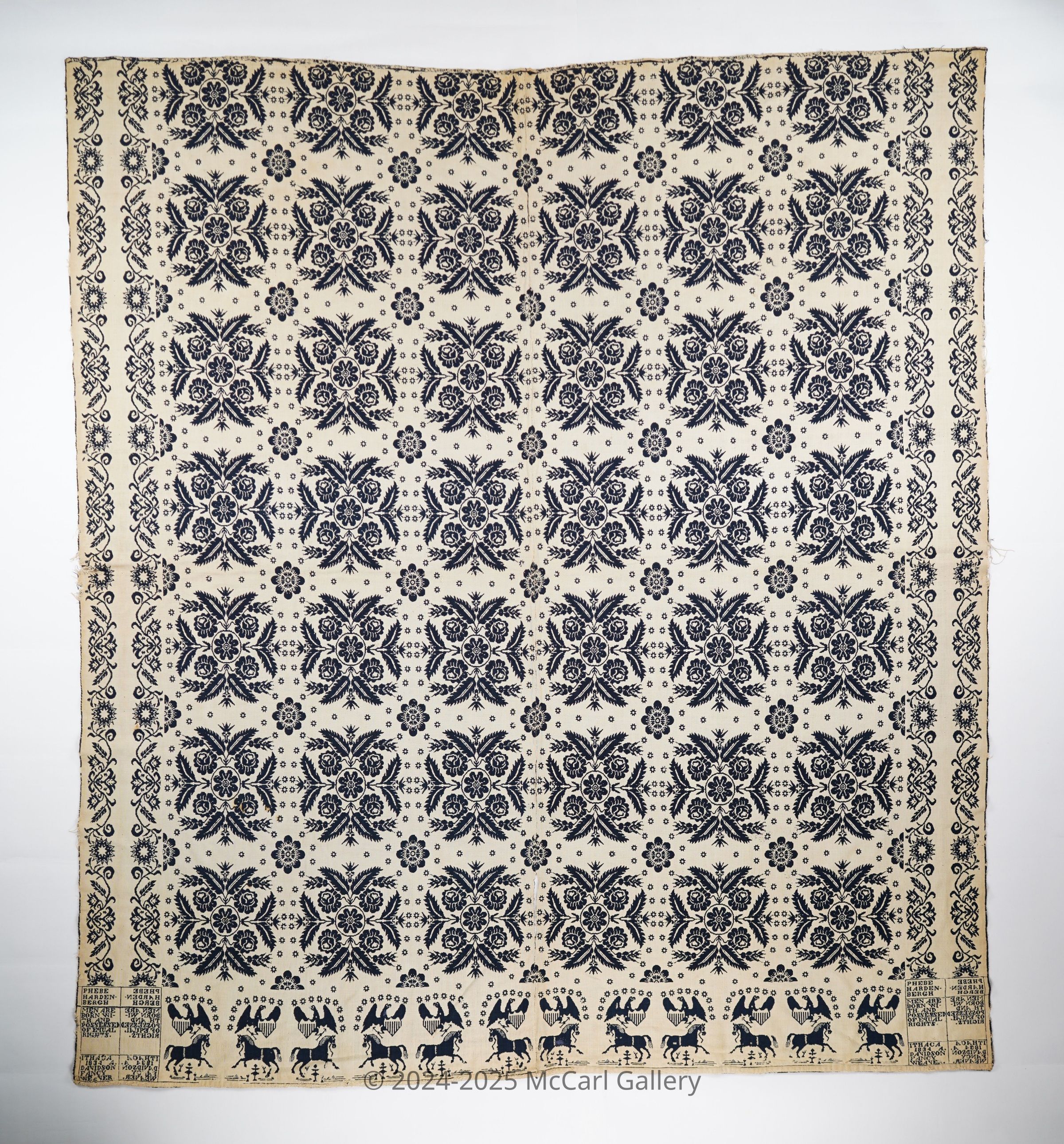 Navy and natural figured doubleweave coverlet with border on three sides. Two joined panels. Woven for Phebe Hardenbergh Hamilton by Archibald Davidson in Ithaca, Tompkins Co., New York in 1834. Cornerblocks feature the saying "Men are born with and possessed of equal rights."Collection