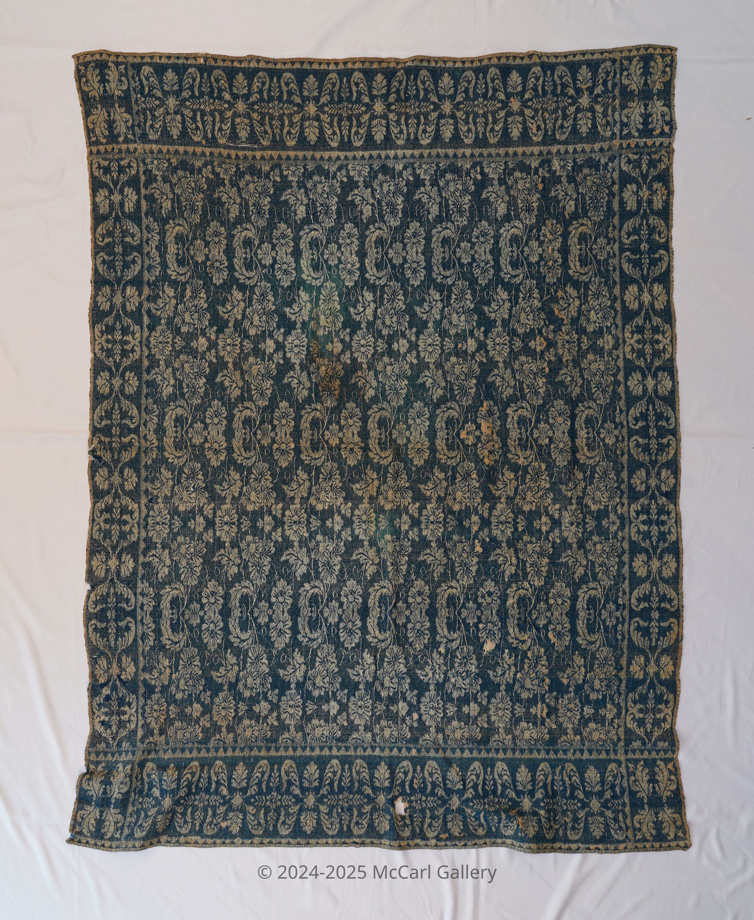 Navy and natural figured damask tablecloth; seamless. Border on four sides, no fringe.