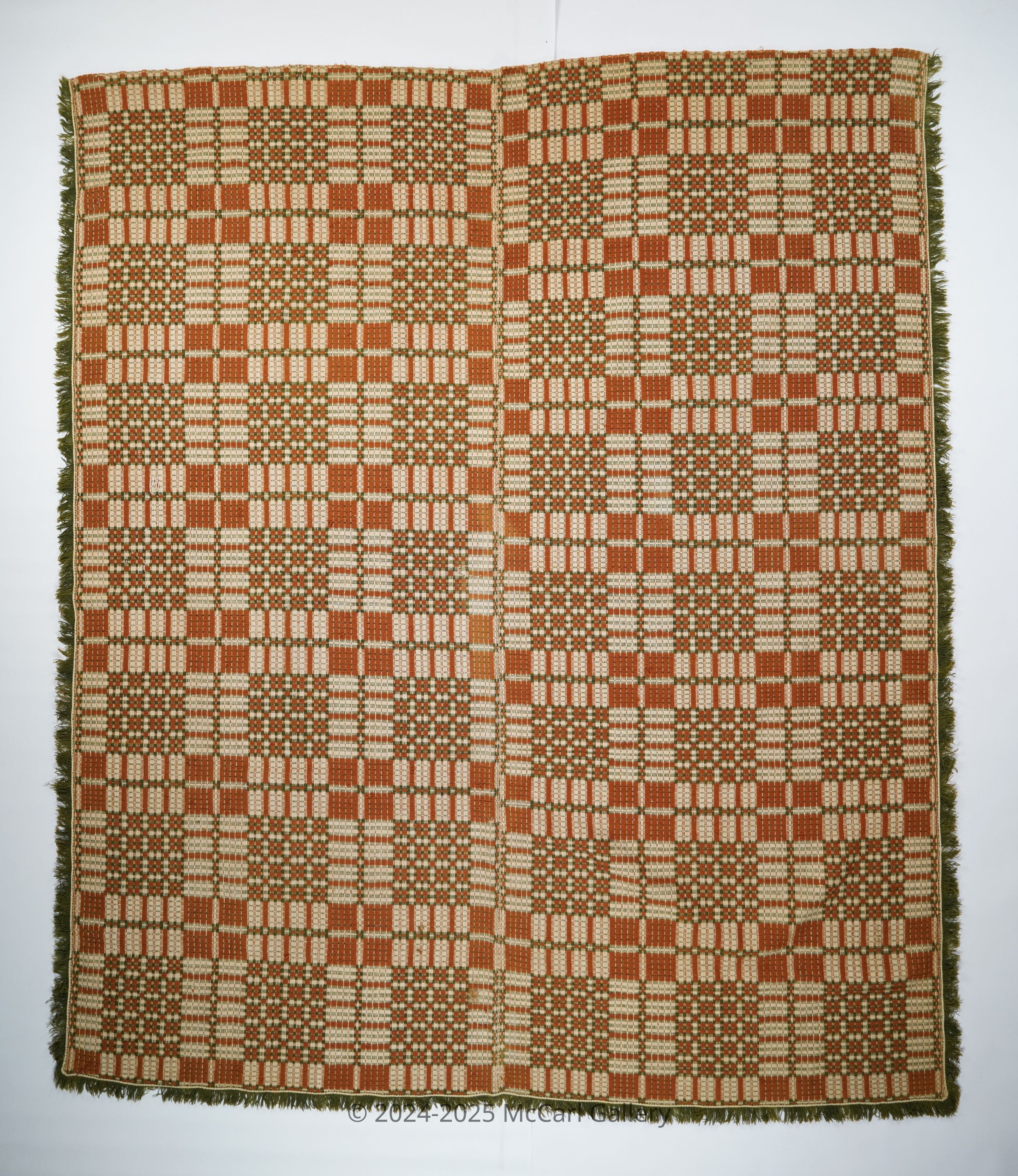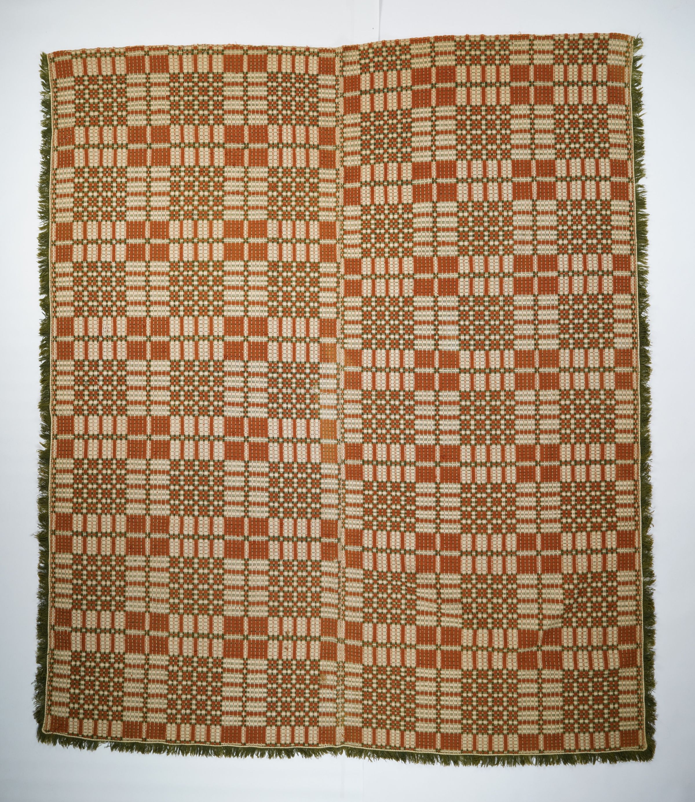 Orange, green, and natural geometric overshot coverlet with applied fringe on three sides. Two joined panels.Collection