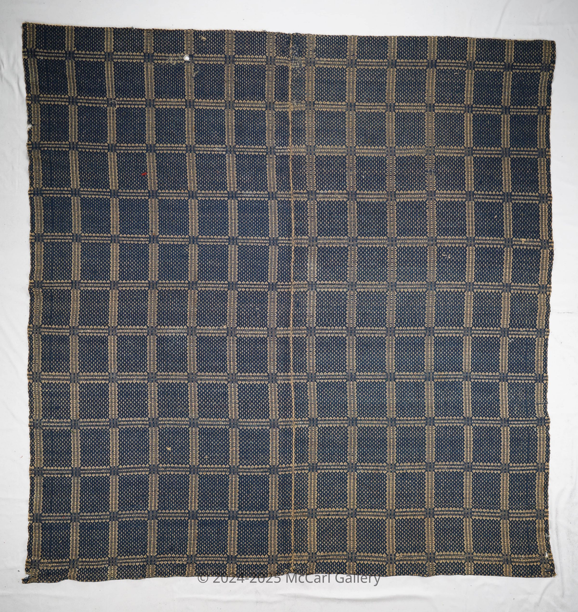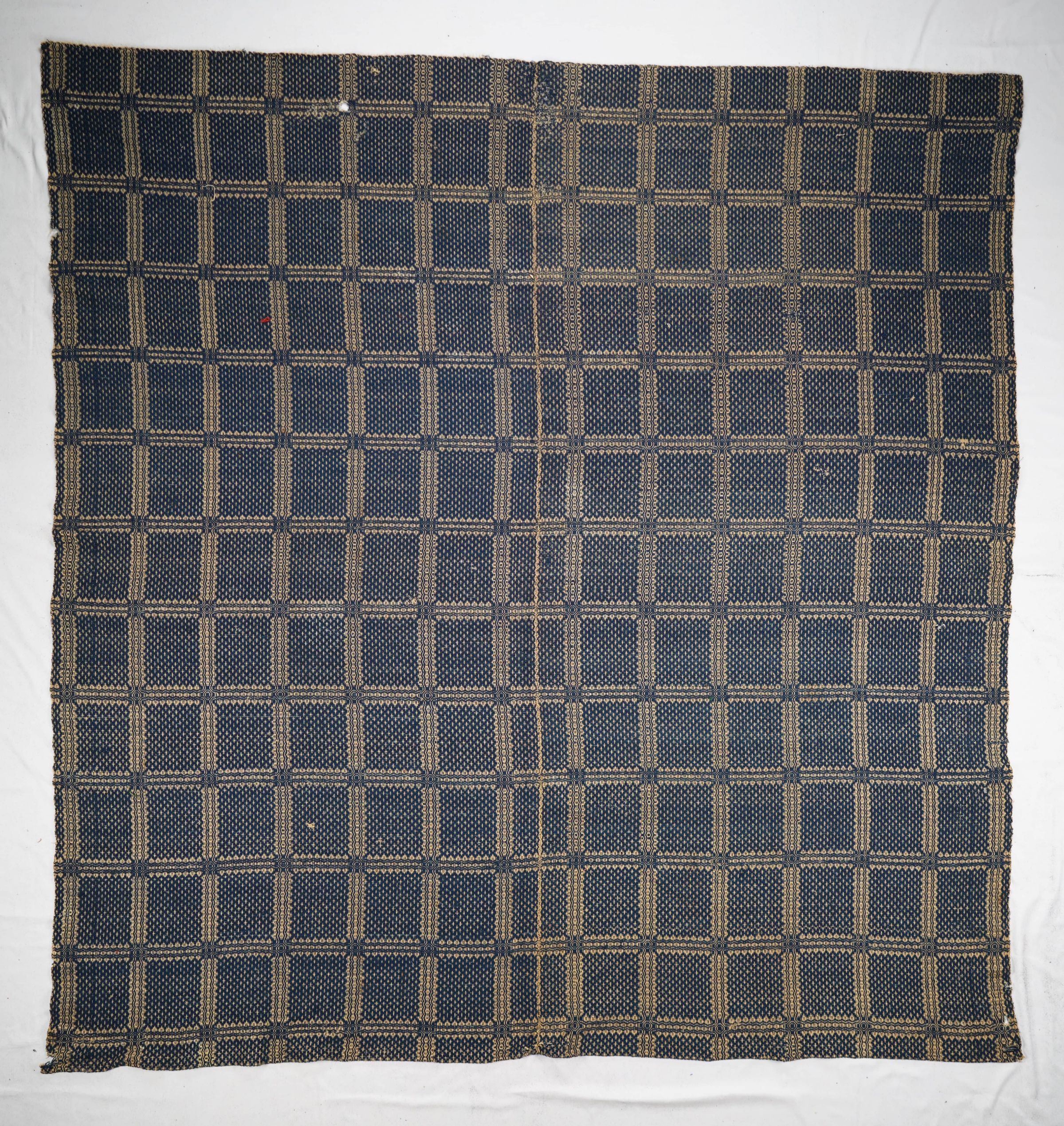 Natural and navy geometric overshot coverlet; two panels joined by a center seam. No fringe or border.