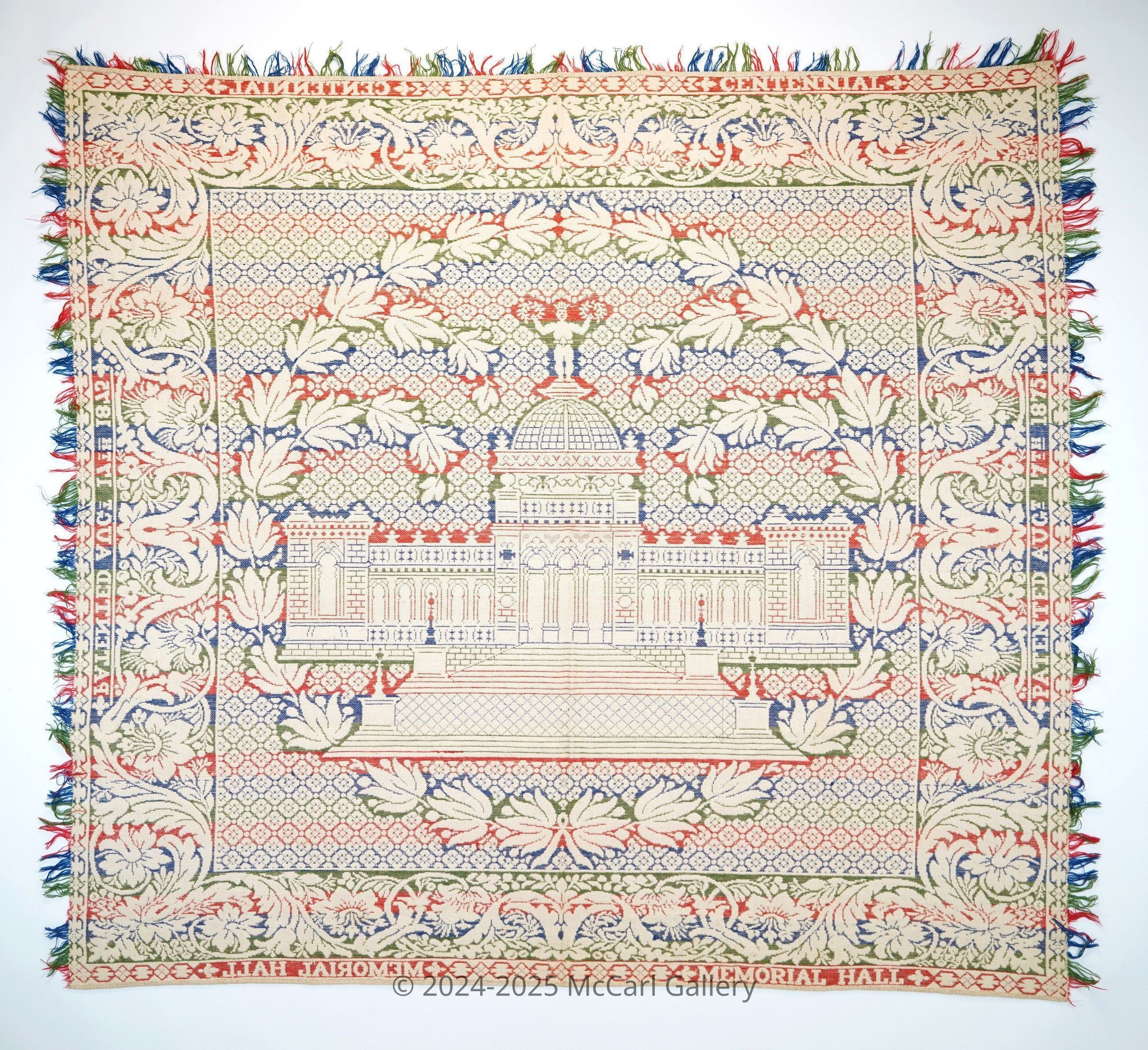 Centennial 1876 Jacquard Coverlet. Patented 17 August 1875 and also inscribed “Memorial Hall.” Power woven with full loom width, doubleweave. Cotton with wool weft in red, green and blue. Has a leaf vine and pendant flower borders with memorial hall in the middle; 84 x 81”.