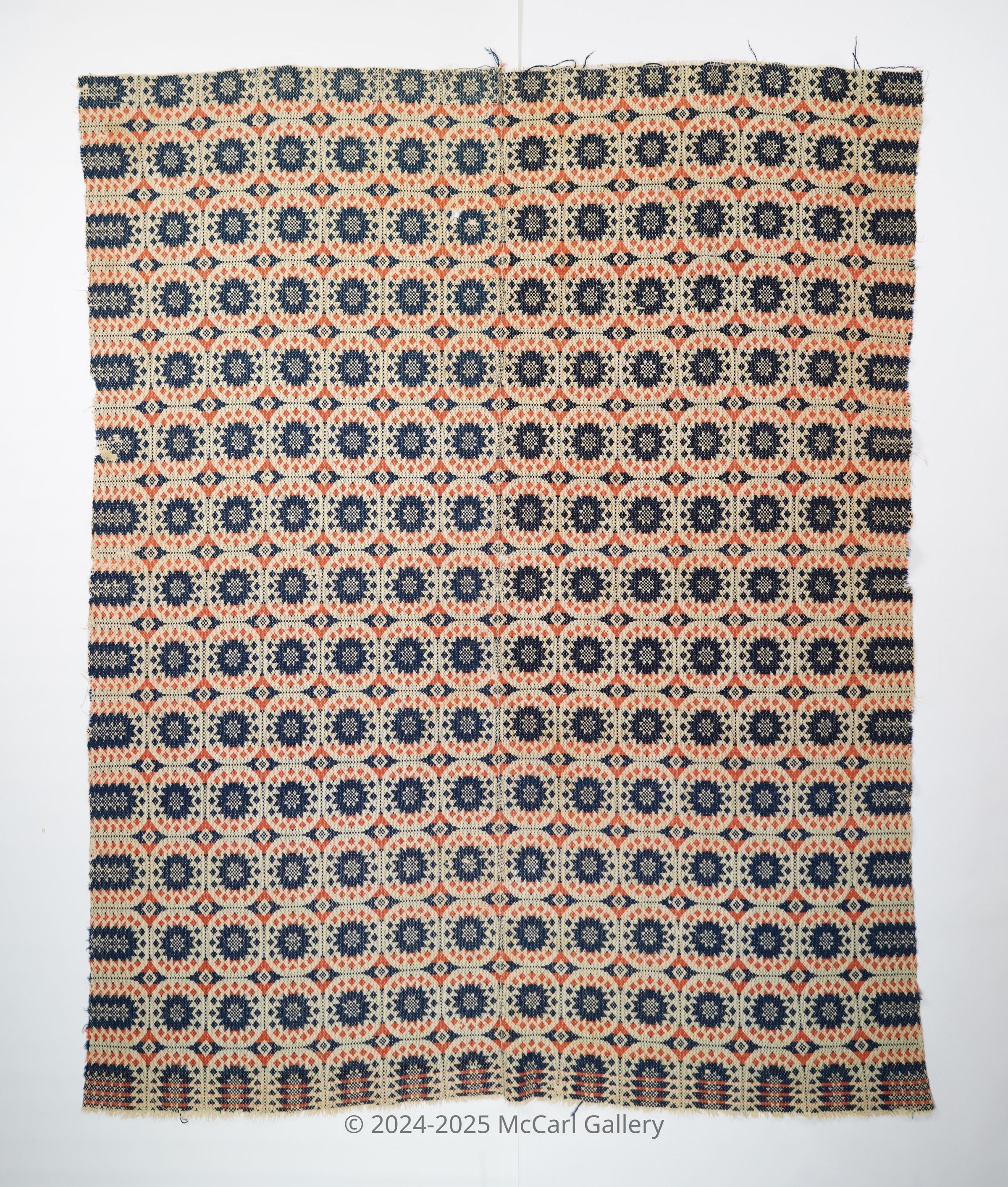 Red, navy, and natural geometric overshot coverlet with border on three sides. Two joined panels.