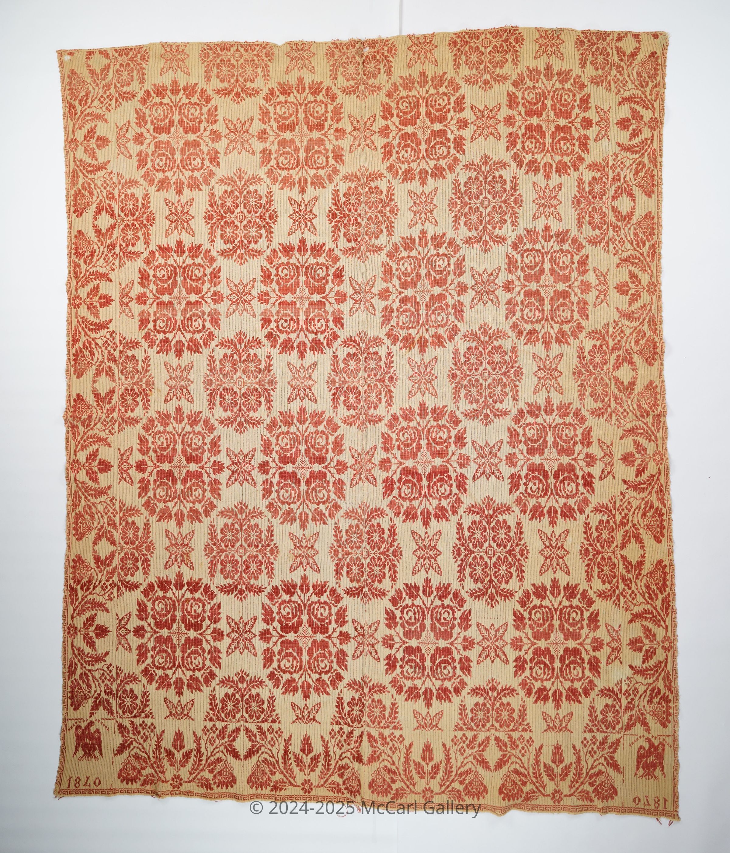 Red and natural figured tied beiderwand coverlet with border on three sides. Two joined panels. Woven in 1840.Collection