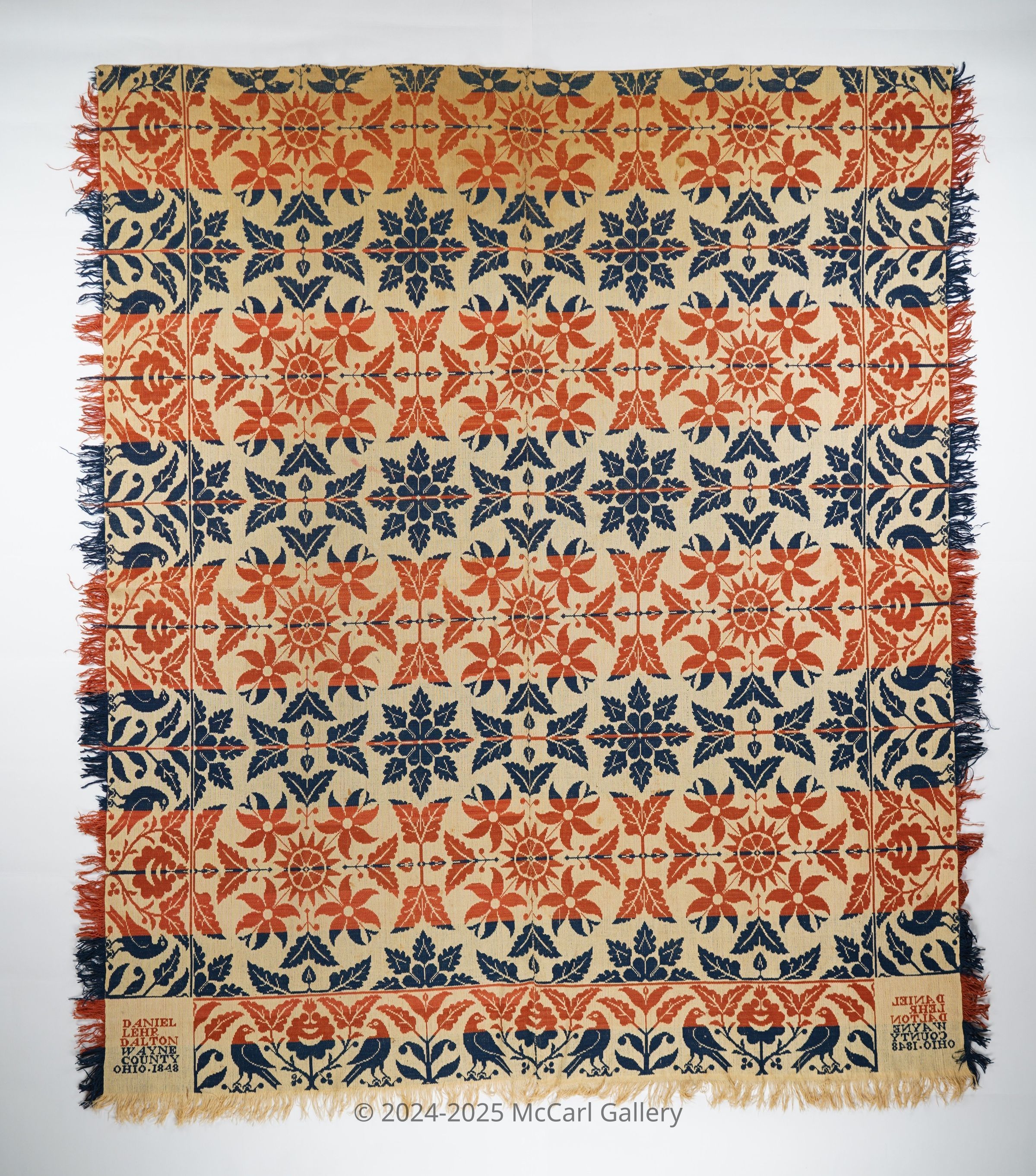 Red, navy, and natural figured tied beiderwand coverlet with border and self-fringe on three sides. Woven by Daniel Lehr in Dalton, Wayne Co., Ohio in 1848.Collection
