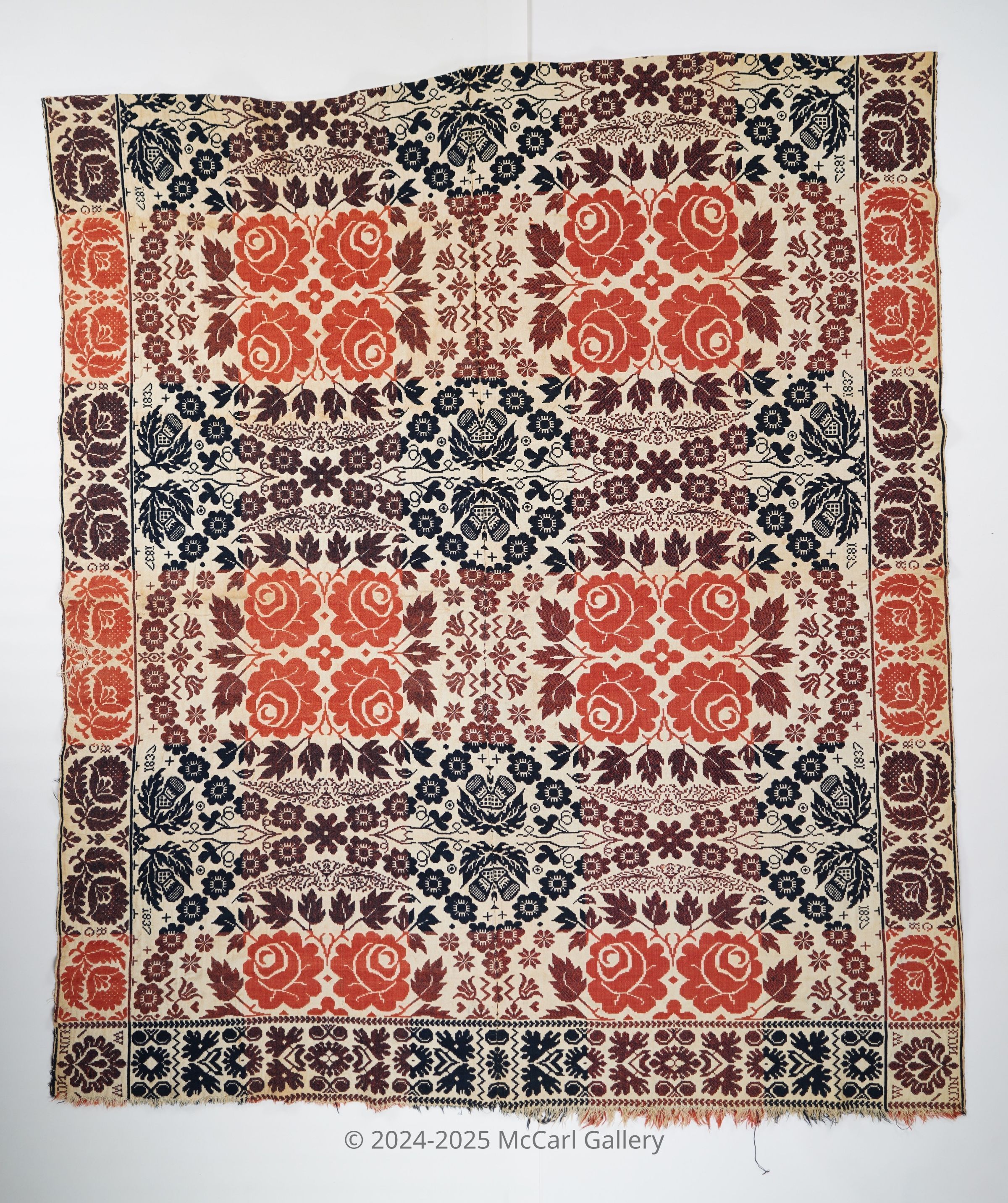 Navy, red, and natural figured double weave coverlet with self-fringe on bottom and border on three sides. Two joined panels. Woven by William Lunn in Ohio in 1837 for R.G.Collection