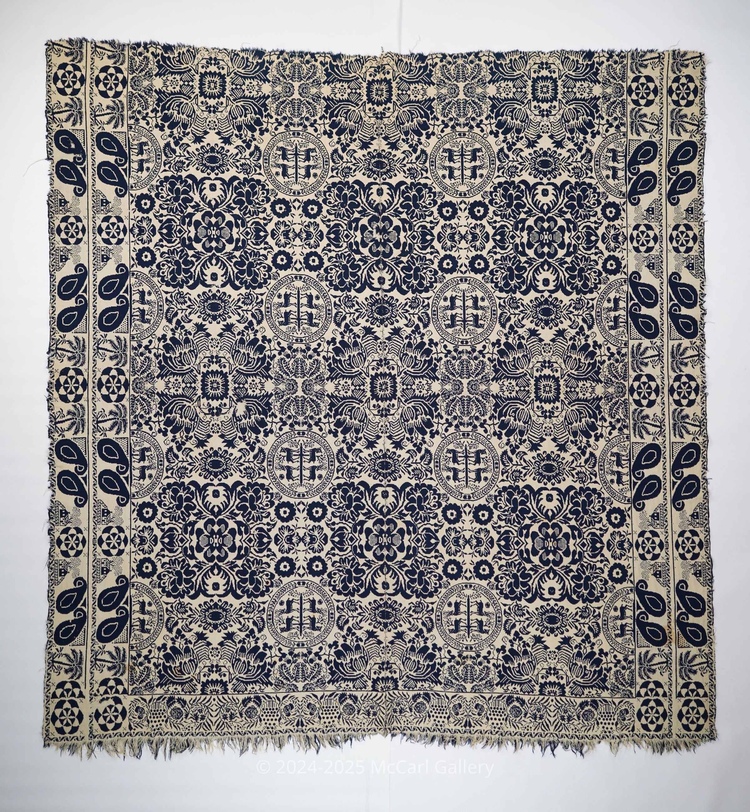 Navy and natural figured double weave coverlet with border on three sides and self-fringe along bottom. Two joined panels.