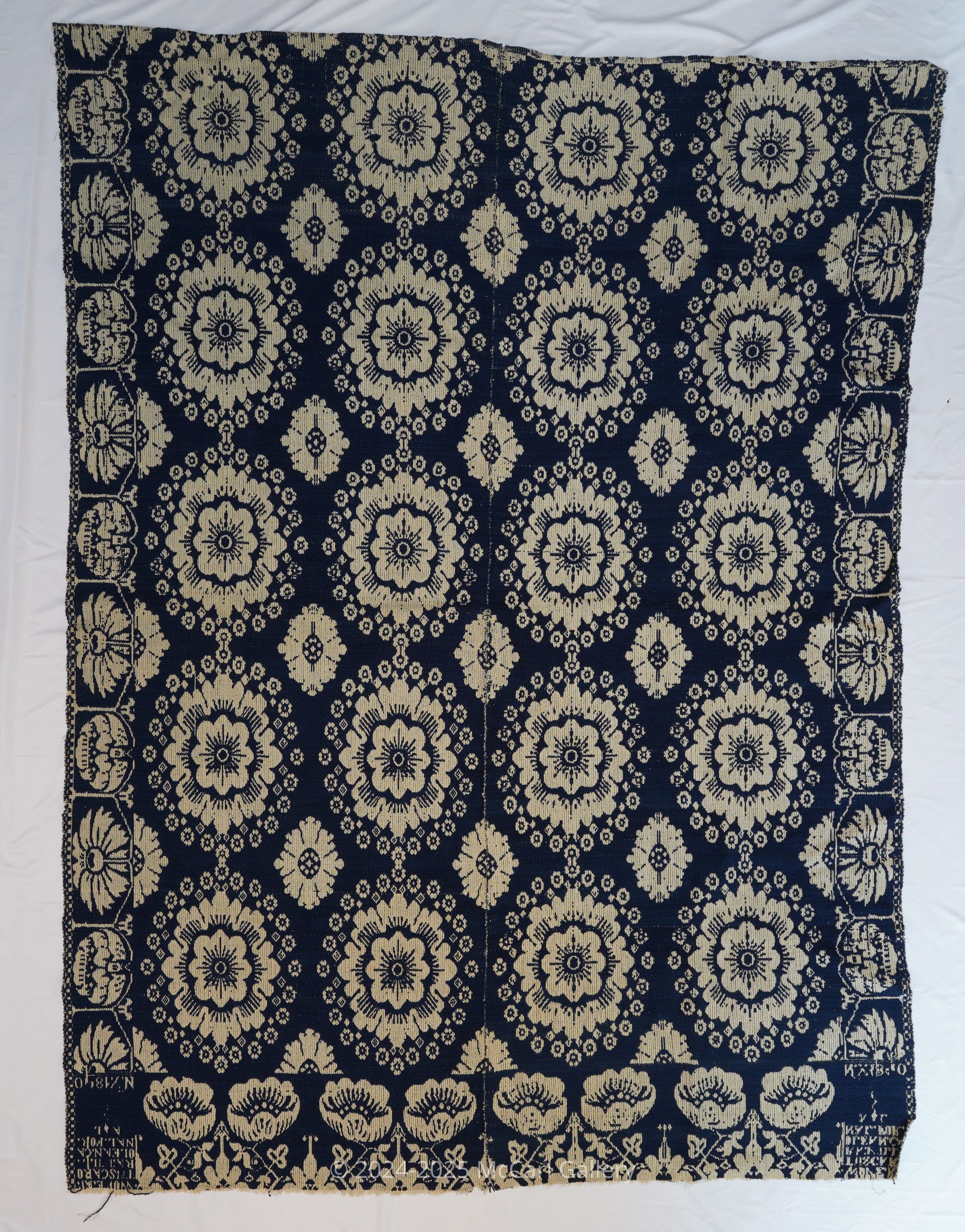 Natural and navy figured tied beiderwand coverlet; two panels joined by a center seam. Border on three sides, no fringe.Collection