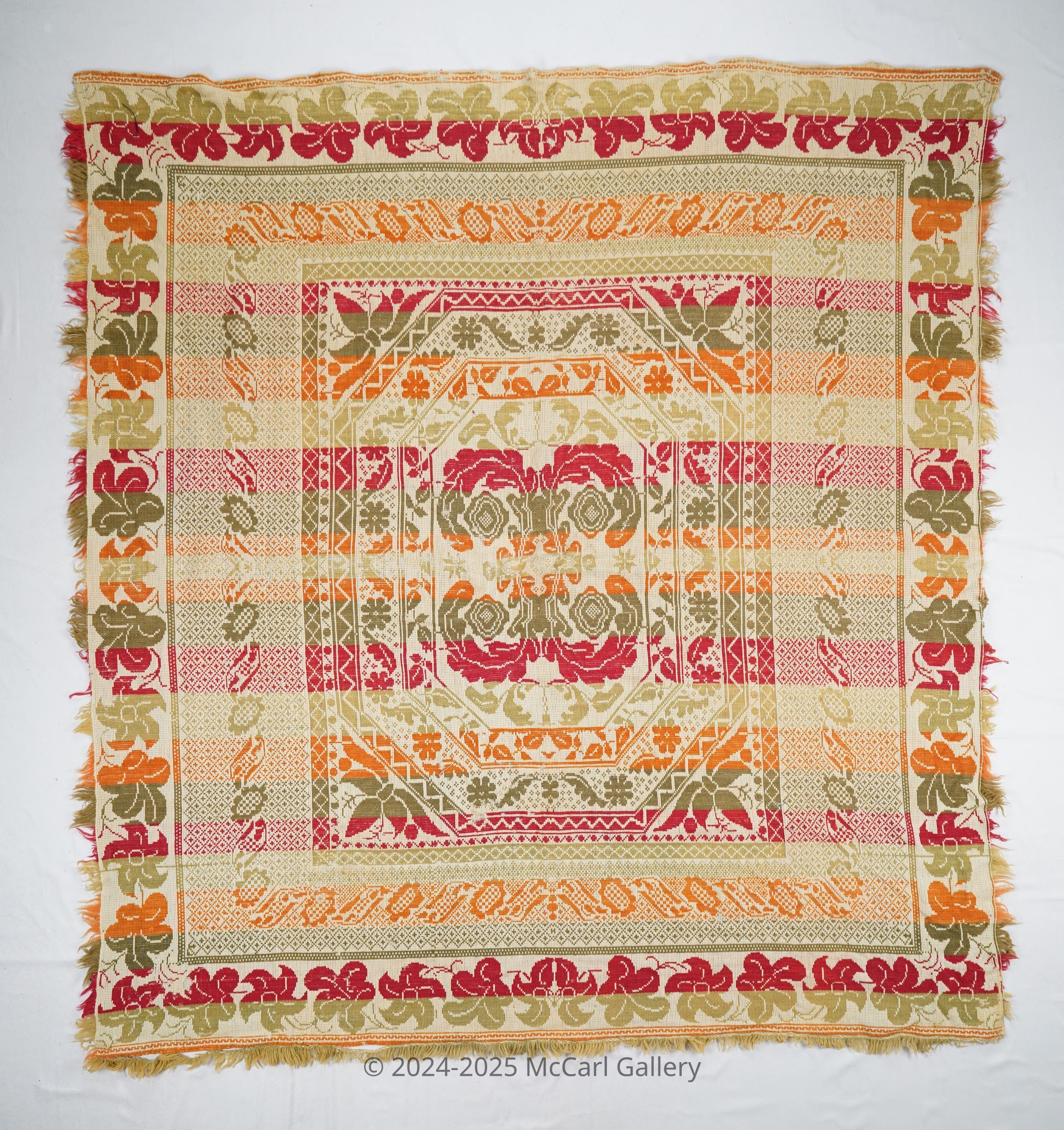 Orange, red, green, tan, and natural figured tied beiderwand 3:1 coverlet; seamless. Border on four sides; fringe on three sides.