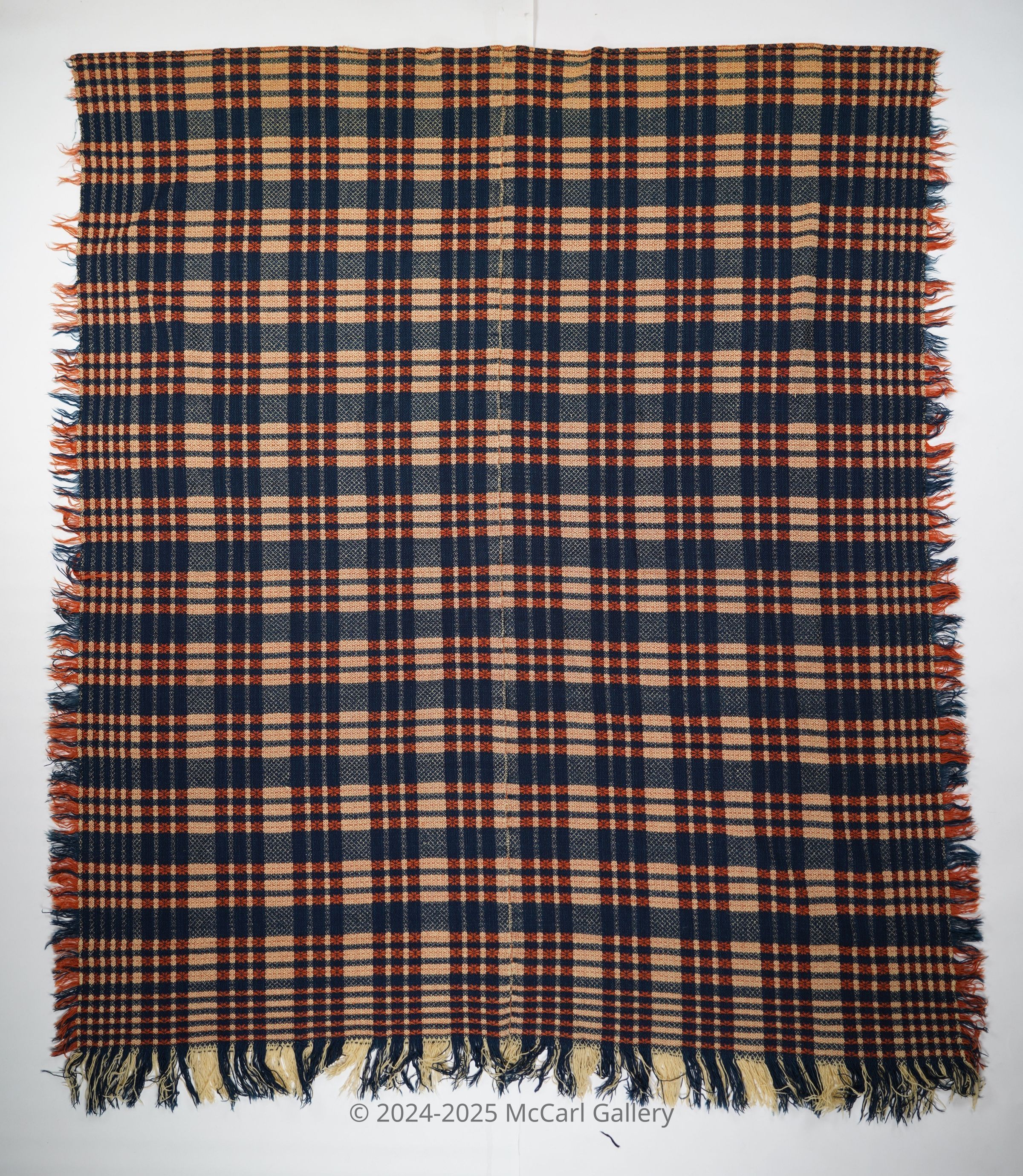 Red, navy, and natural geometric point twill coverlet with border and self-fringe on three sides.Two joined panels.Collection
