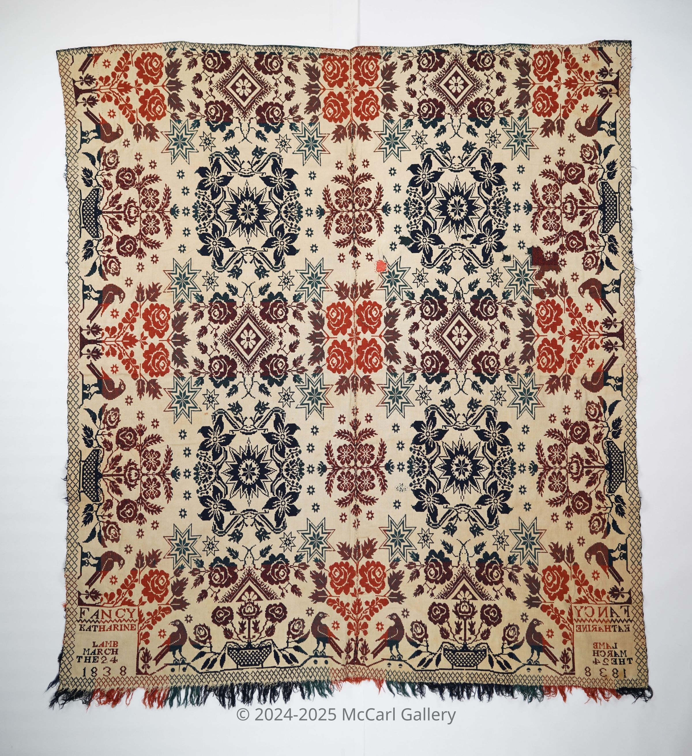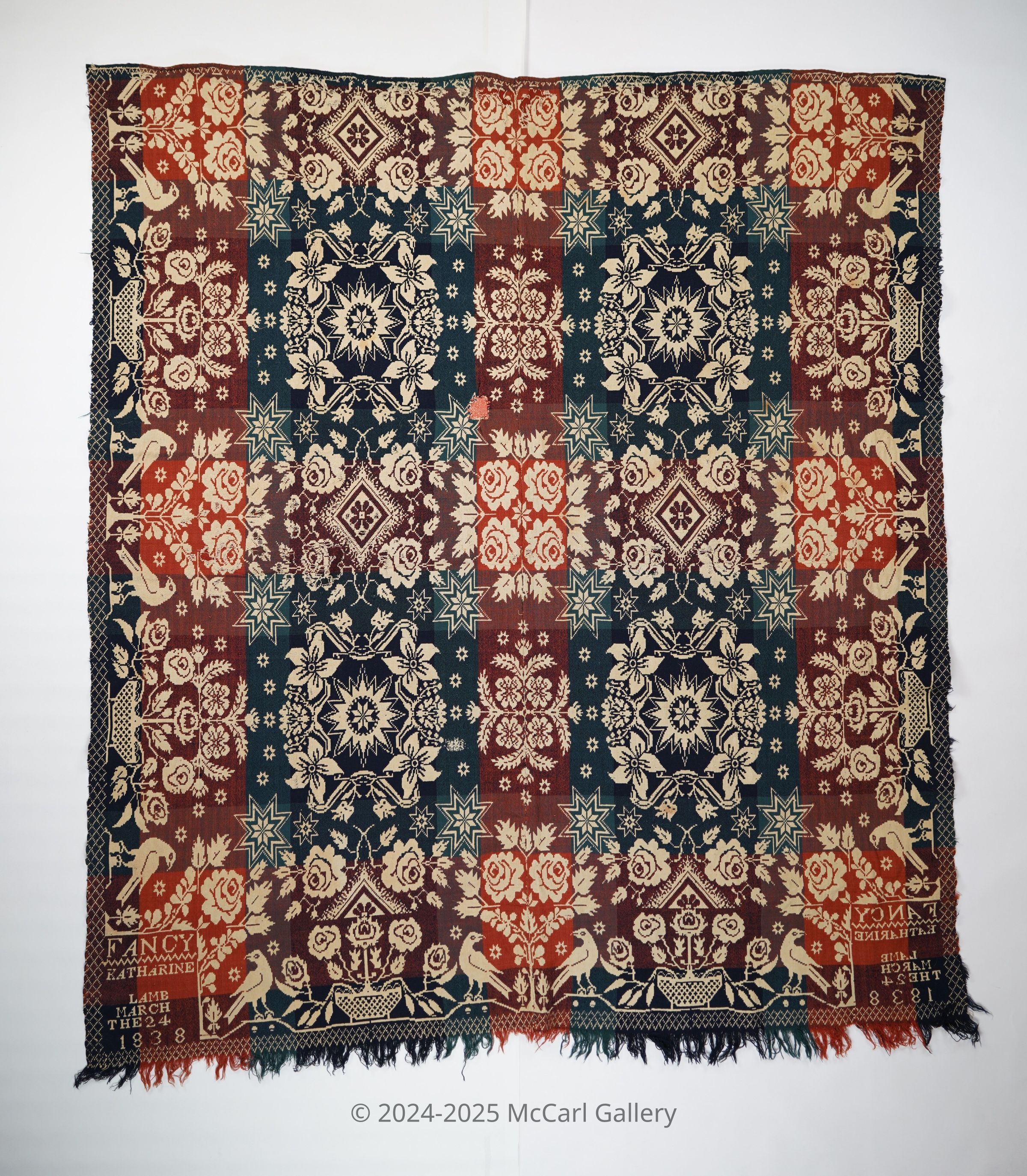 Red, navy, and natural figured double weave coverlet with border on thee sides and self fringe along the bottom. Two joined panels. Woven for Katharine Lamb on March 24, 1838.Collection