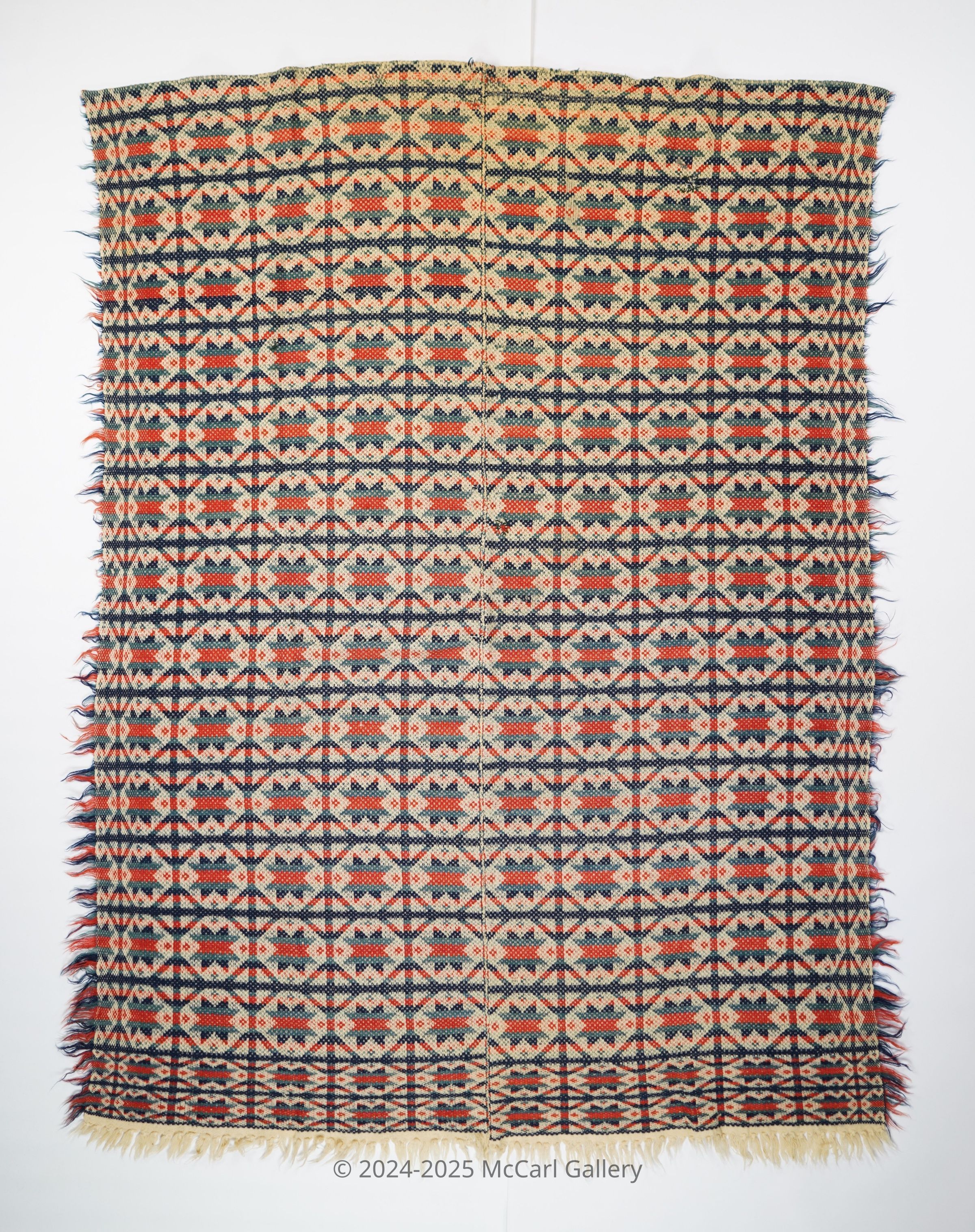 Red, navy, blue/green, natural geometric starwork coverlet with self-fringe and border on three sides. Two joined panelsCollection