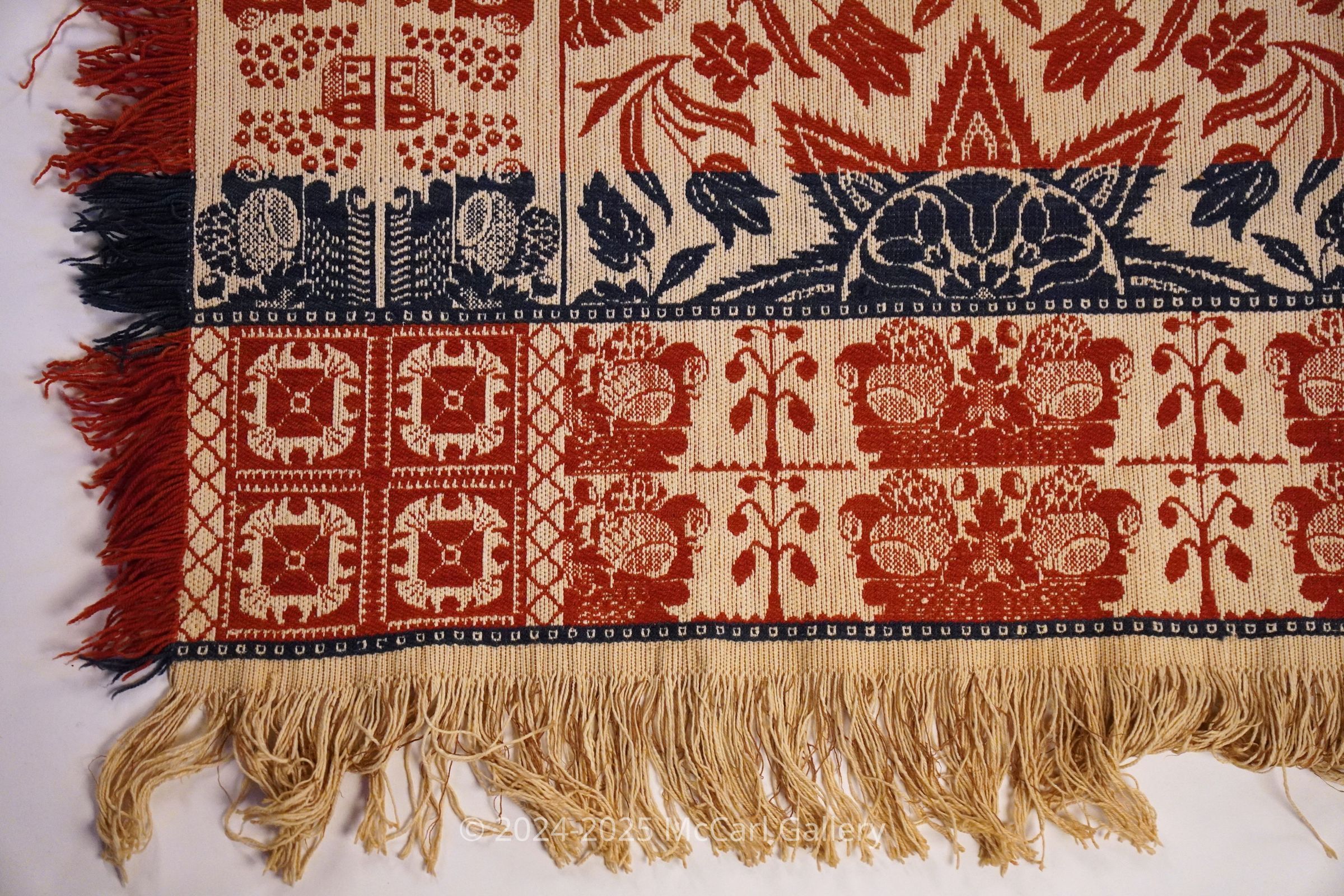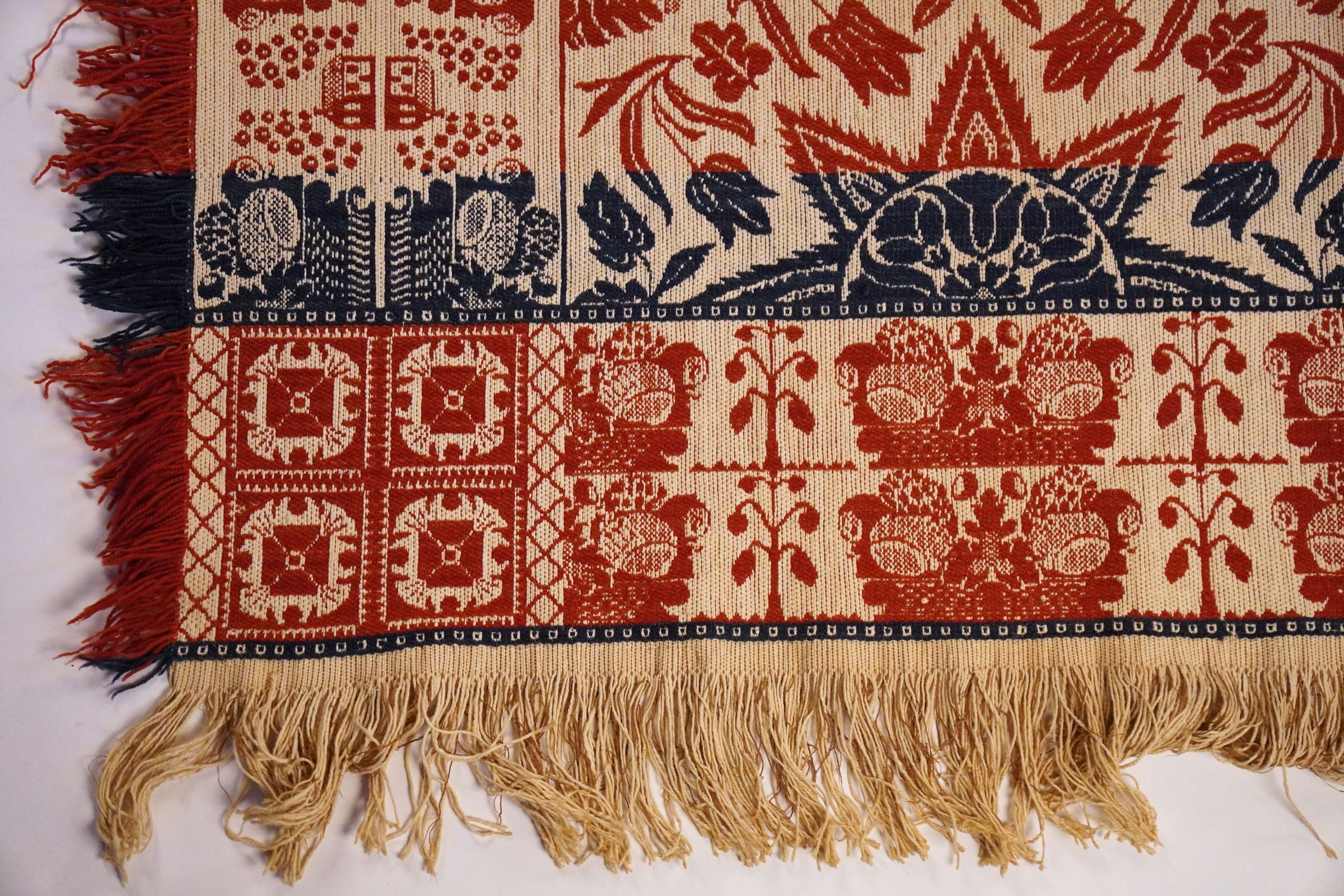 Red, navy, and natural figured tied beiderwand coverlet with self-fringe and border on three sides.