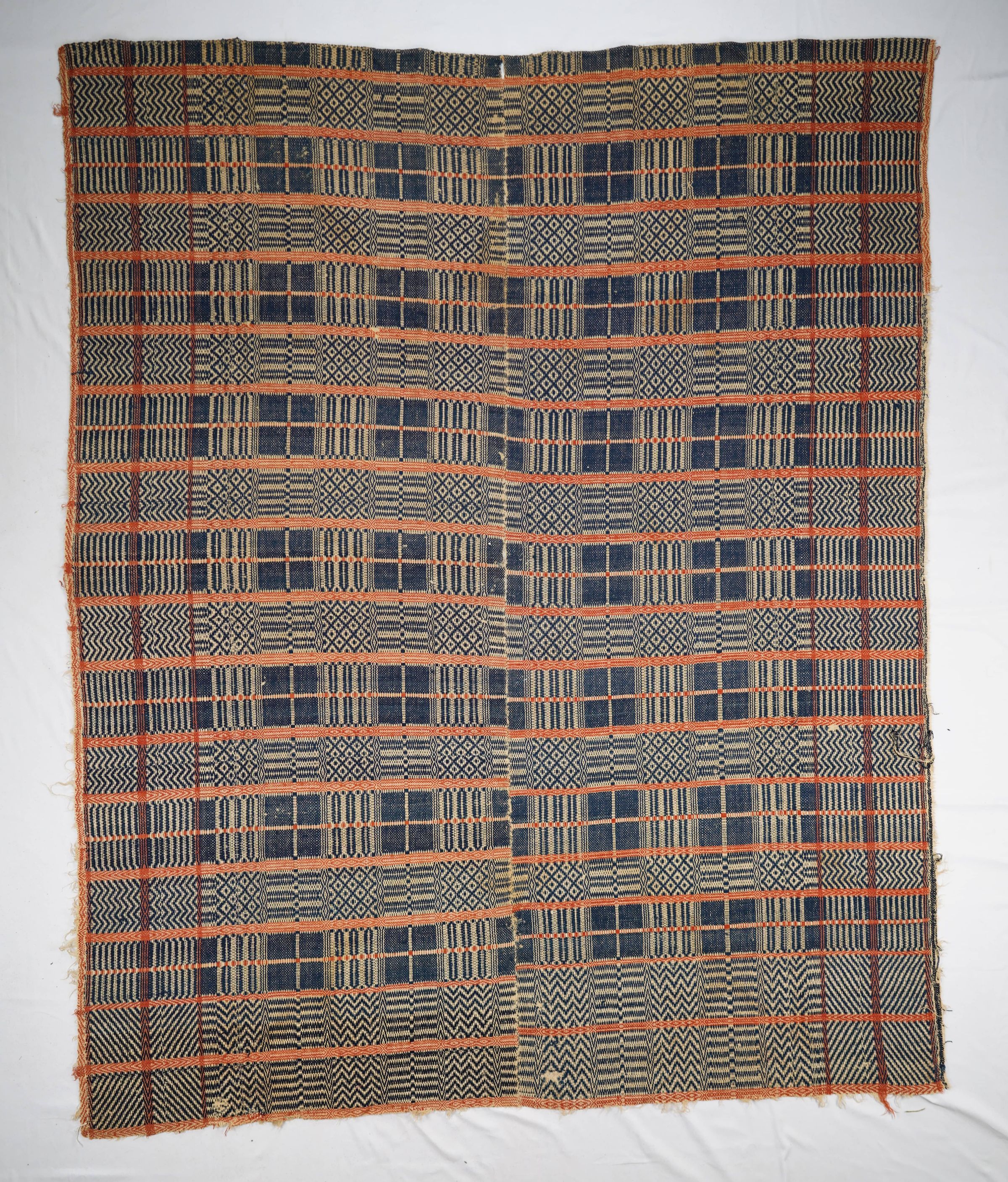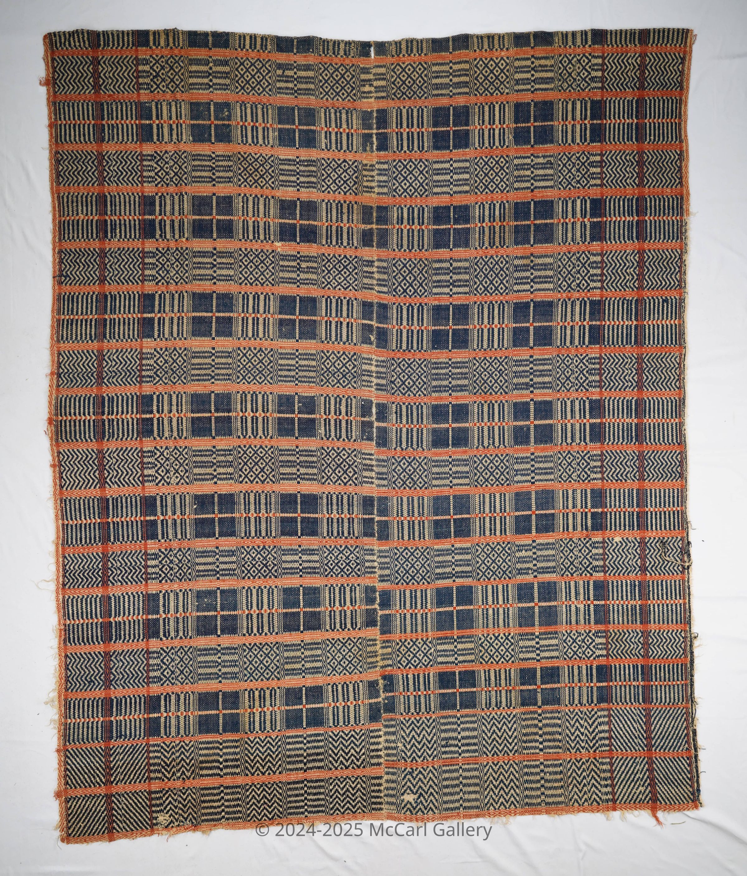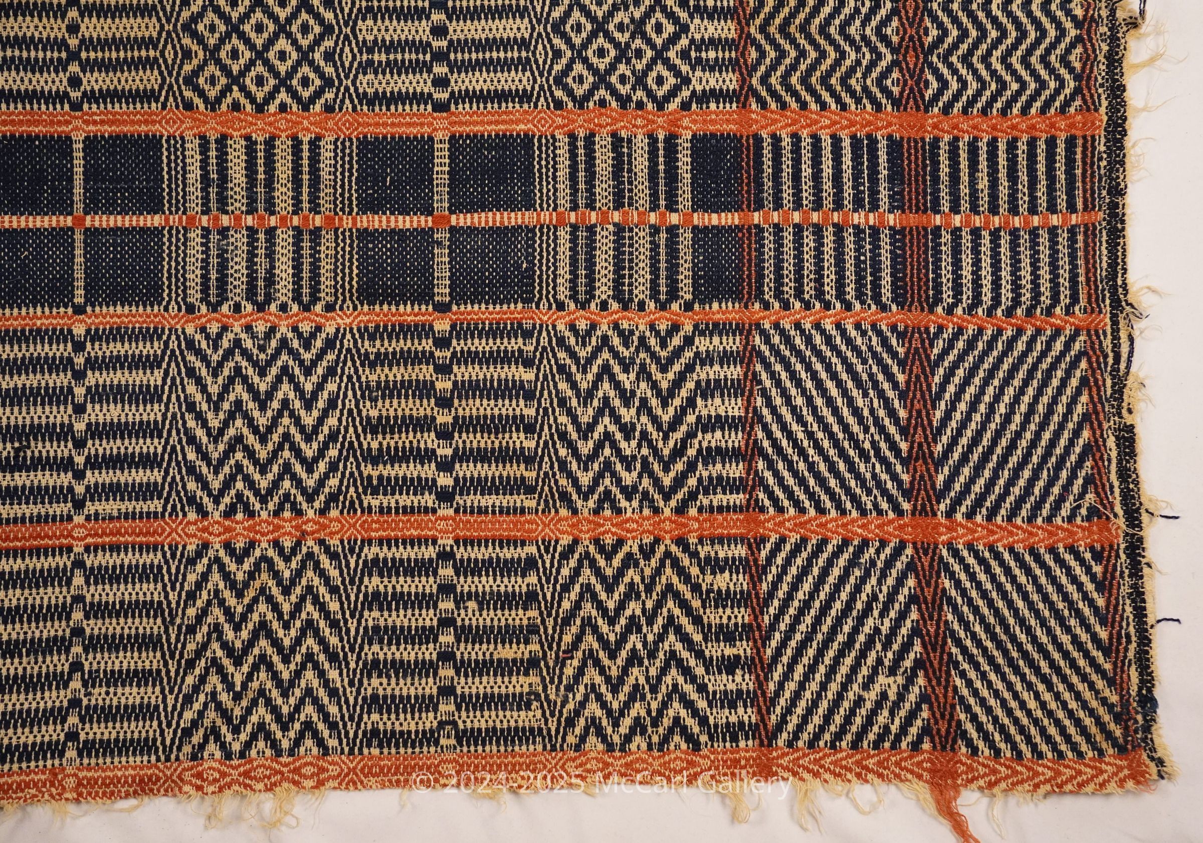 Natural, navy, and red geometric overshot coverlet; two panels joined by a center seam. Border on three sides; no fringe.