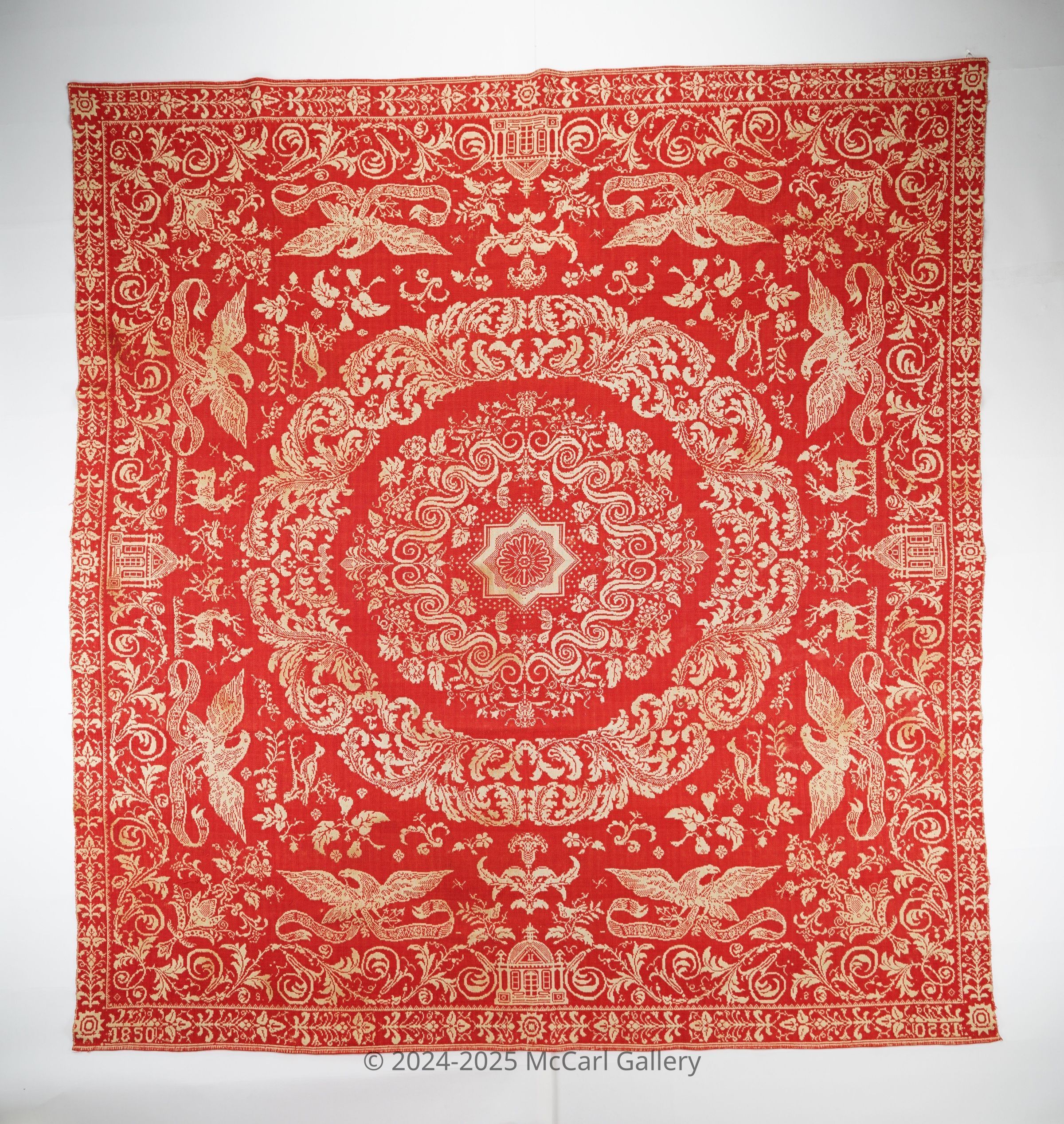 Red and natural figured doubleweave coverlet with border. Attributed to New York. Woven in 1850.Collection