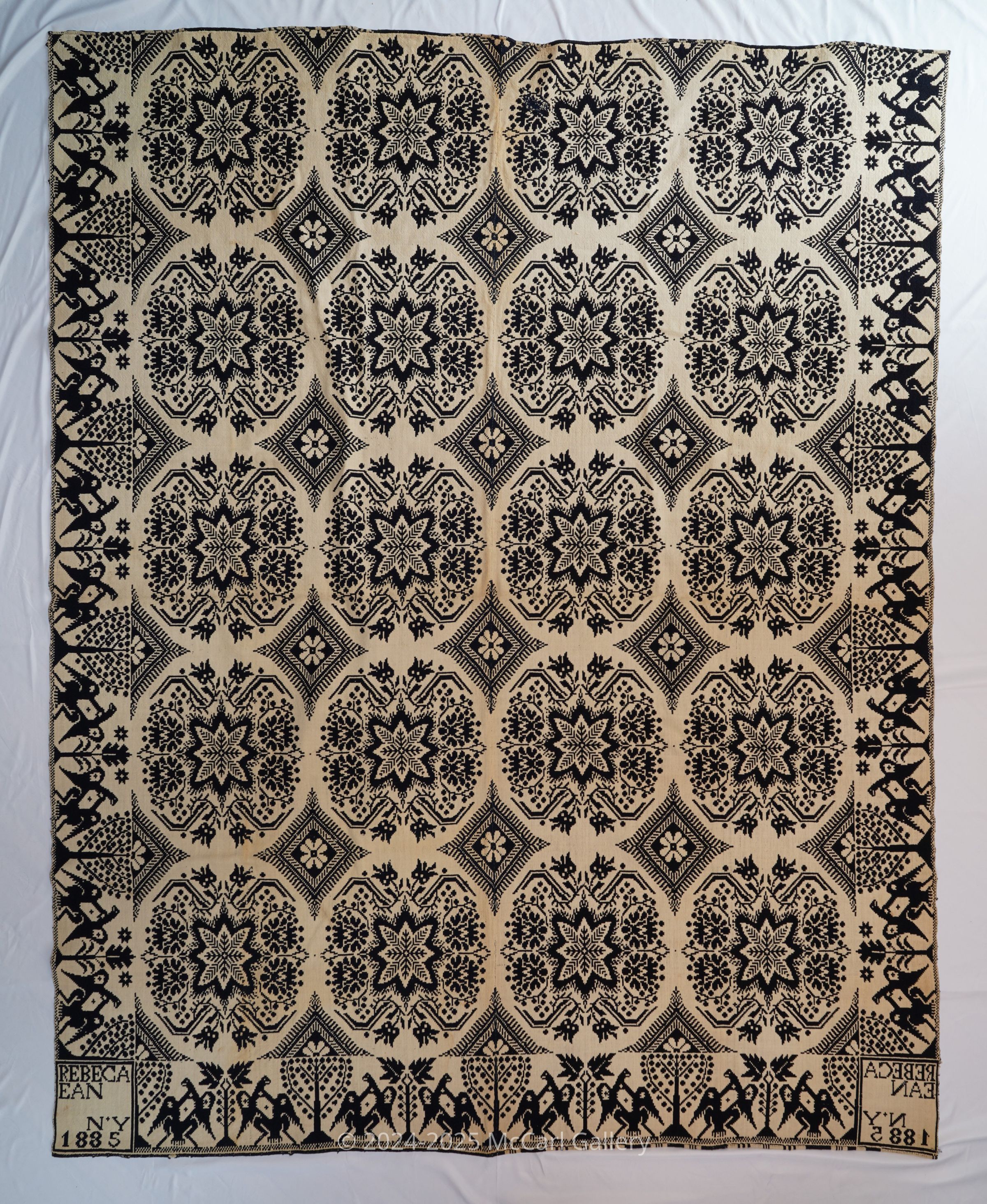 Natural and navy figured double weave coverlet; two panels joined by a center seam. Border on three sides, no fringe.Collection
